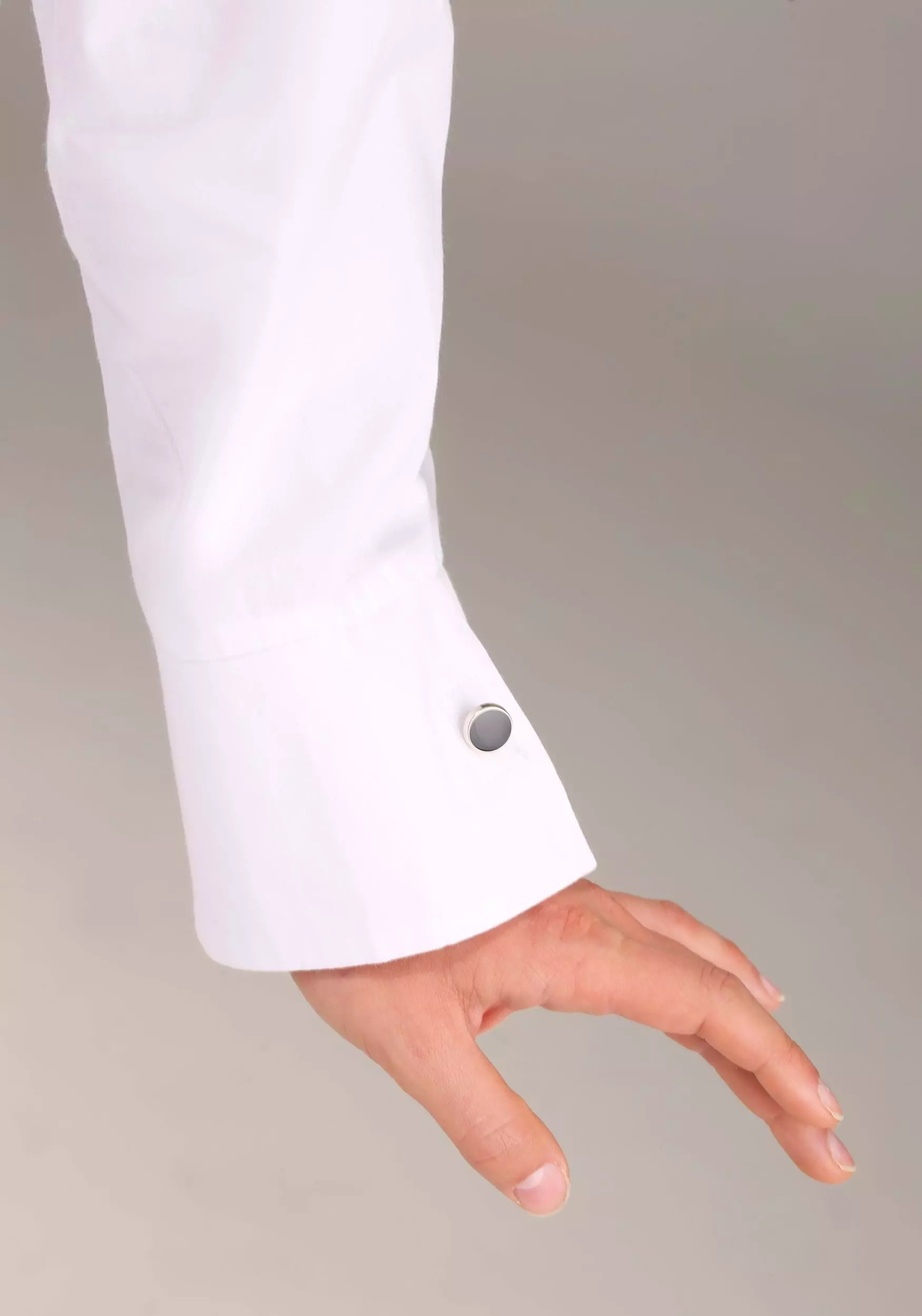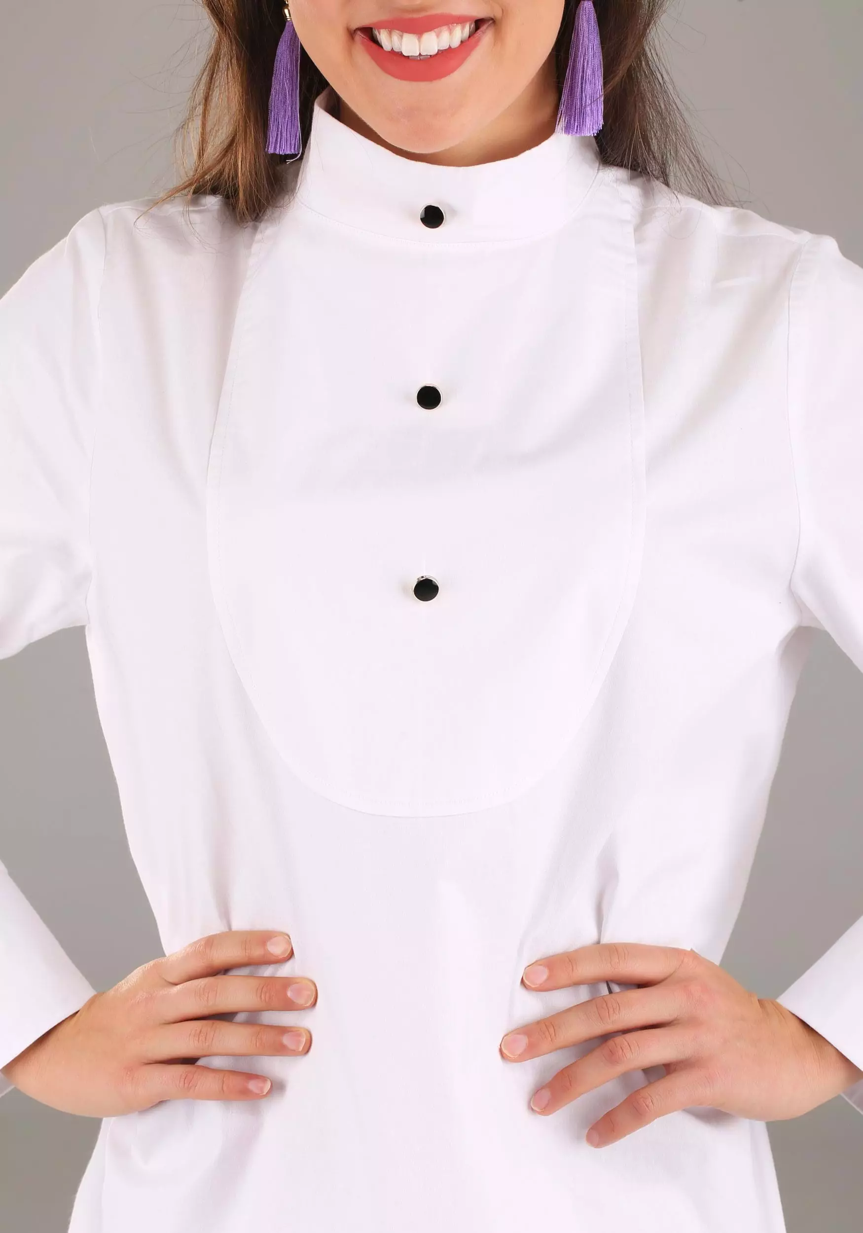 A far cry from the usual sweats you wear to bed, this exclusive costume is an exact replica of Holly’s alluring and elegant sleeping ensemble, crafted in our very own costume studio. It’s a tuxedo-inspired, oversized sleep shirt with black buttons, a stand-up collar, and side slits. The purple earrings provide a pop of color and style and prove you stayed up a bit too late last night partying, and the mask, well, only Holly Golightly could possess such an ornate and truly eye-catching satiny eye mask (until now, that is)!