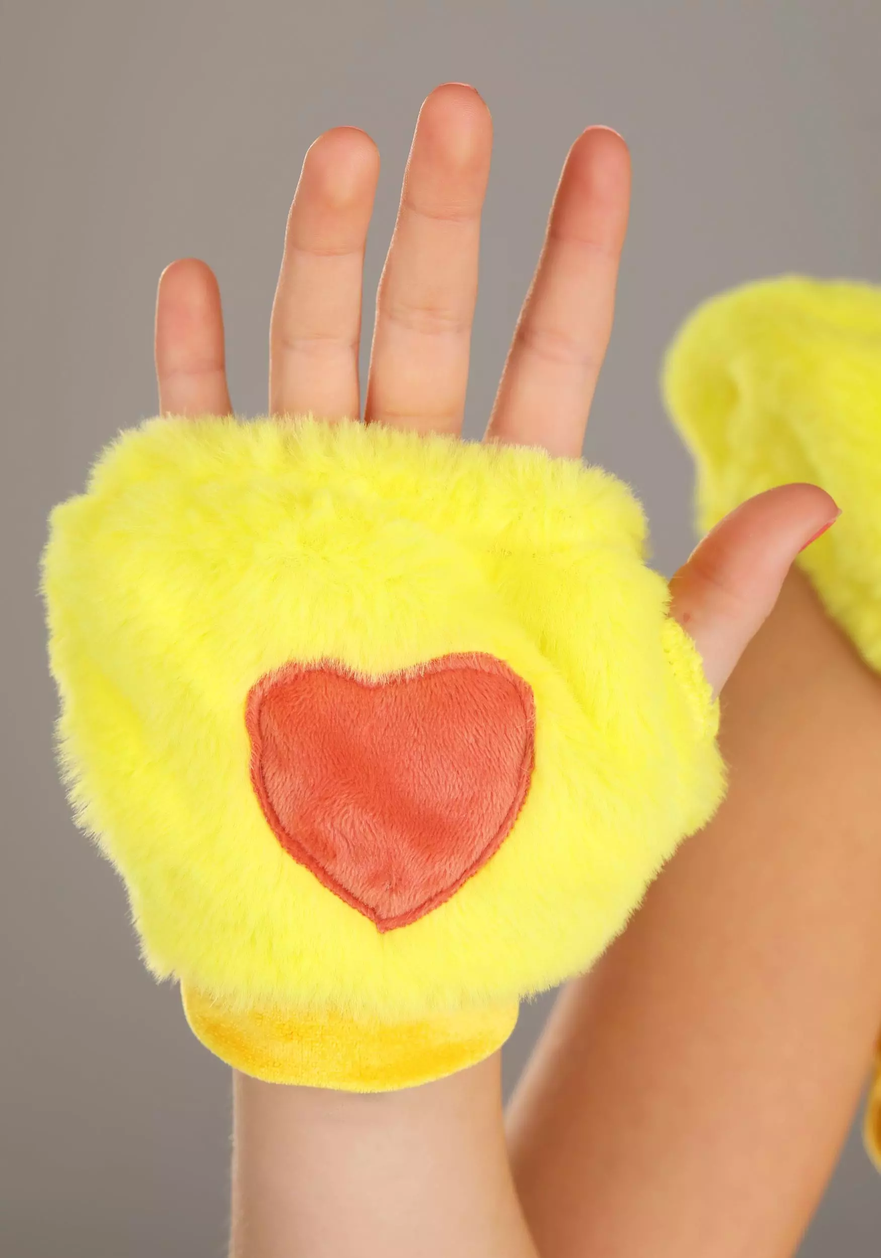 - Faux fur pair of gloves have elastic bands and minky fleece hearts