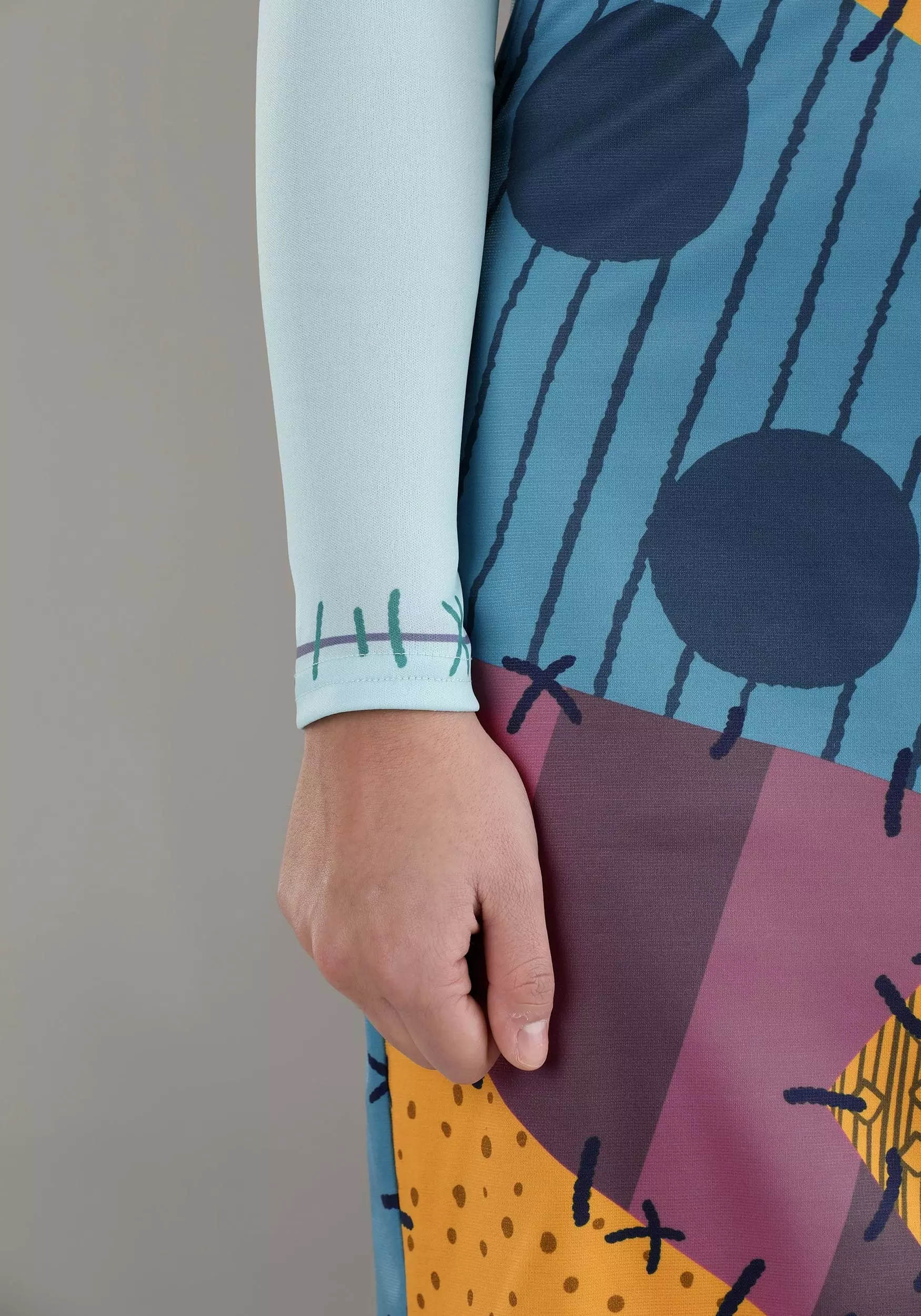 It begins by giving yourself a dreadfully delightful doll look thanks to the fitted jersey dress and printed leggings that recreate Sally’s stitched style. The dress is printed to bring her patchwork appearance to life and you can top off the transformation with the red yarn wig and oversized leg warmers!