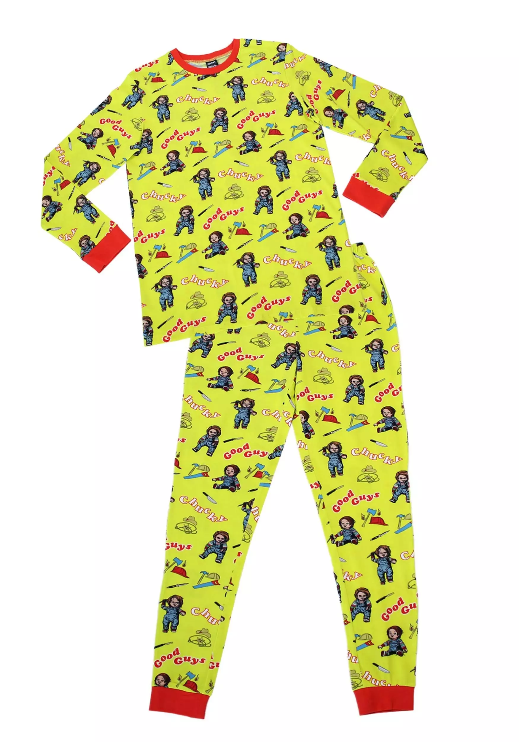 Display your love of classic horror comedy with this officially licensed Cakeworthy Chucky Pajama Set for Adults! The unisex pajamas include a long-sleeved shirt and a pair of ankle-length pants made out of a comfy yellow cotton and polyester blend. Orange cuffs made of ribbed knit material add an extra touch of coziness to keep the drafts out. The pajamas feature an allover print with images of Chucky frolicking amid firefighter, construction worker, and cowboy gear, as well as some murderous-looking knives.Â