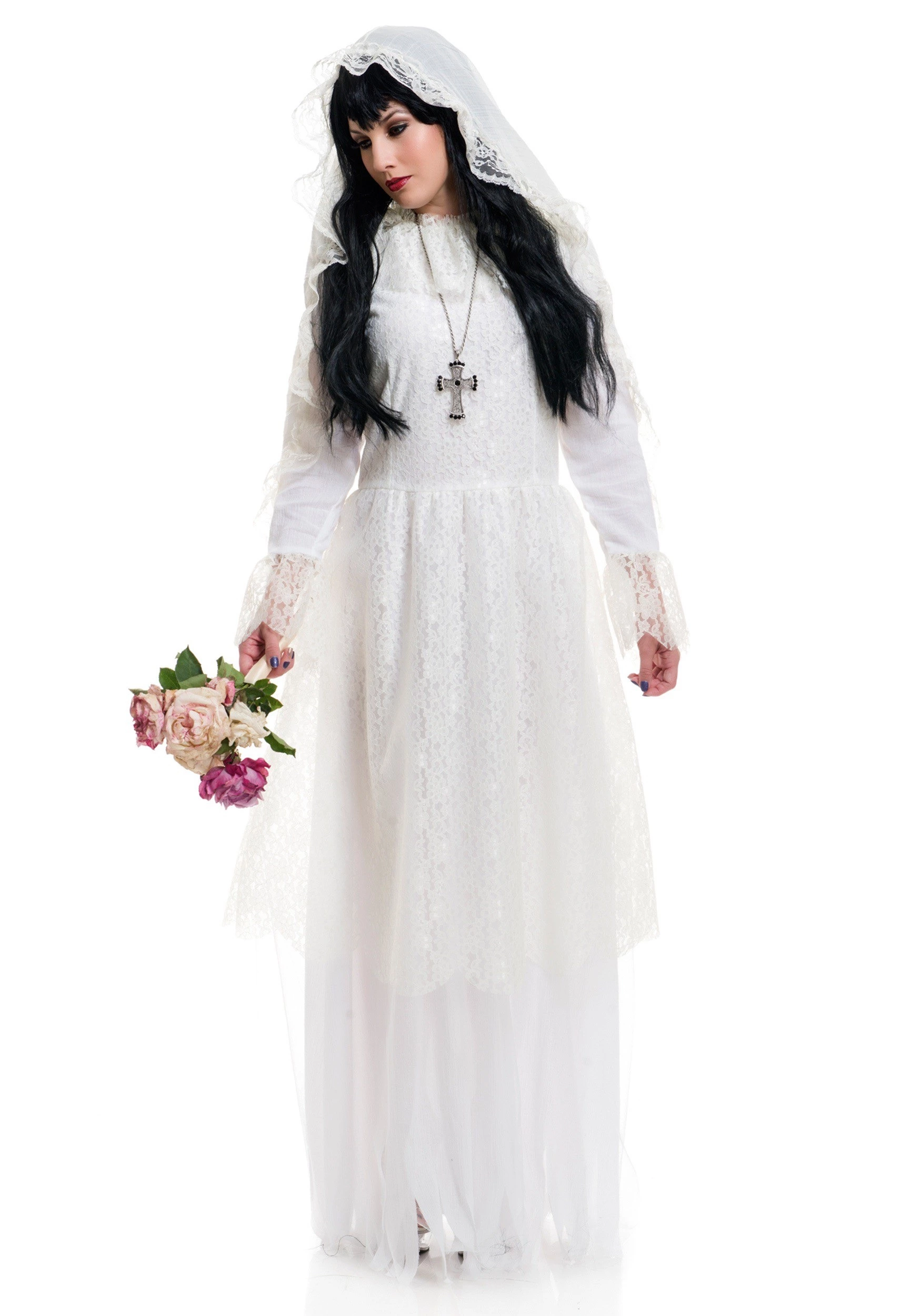 Well, you’re in luck! We have just the costume for you. This nightshade bride costume is the perfect costume for Halloween. Think of all the lucky potential suitors you’ll meet! This white dress has a Hook and Loop fastener closure in the back for a comfortable fit. The dress has a lace overlay throughout as well as a mesh layer in the skirt for an elegant appearance. The lace veil will transform you into the bride you were meant to be! Don’t forget to add some Day of the Dead makeup and a bouquet to really get this bride costume ready for your undead wedding!