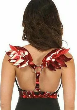 These body harness wings are perfect for pairing a devil costume with the cutest red metallic wings. The chrome hardware and shiny vinyl also complement the red color scheme. If you want to stretch your wings this Halloween, pick up these Women’s Plus Size Red Metallic Devil Wings.
