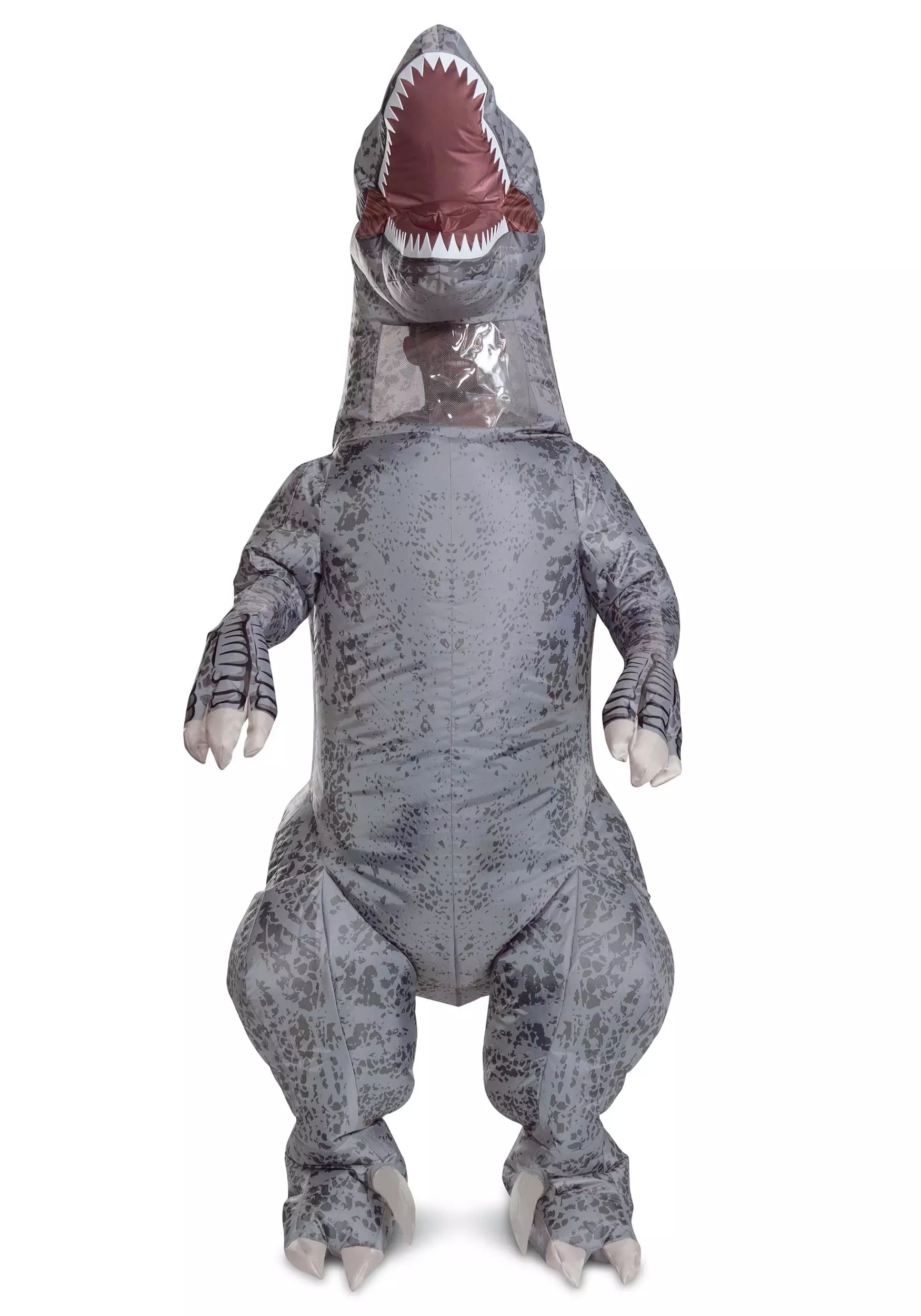 Humans and dinos, watch out! This officially licensed Jurassic World Blue Inflatable Costume for Adults is the predator to reckon with in this new world order. The one-piece costume is made of sturdy windbreaker fabric that covers you from head to toe. When fully inflated, it resembles a huge raptor with a long tail, silvery claws, and a fanged mouth open in a roar. The neck has a clear plastic panel through which you can see where you’re going. A fan is mounted behind the right hip.Â