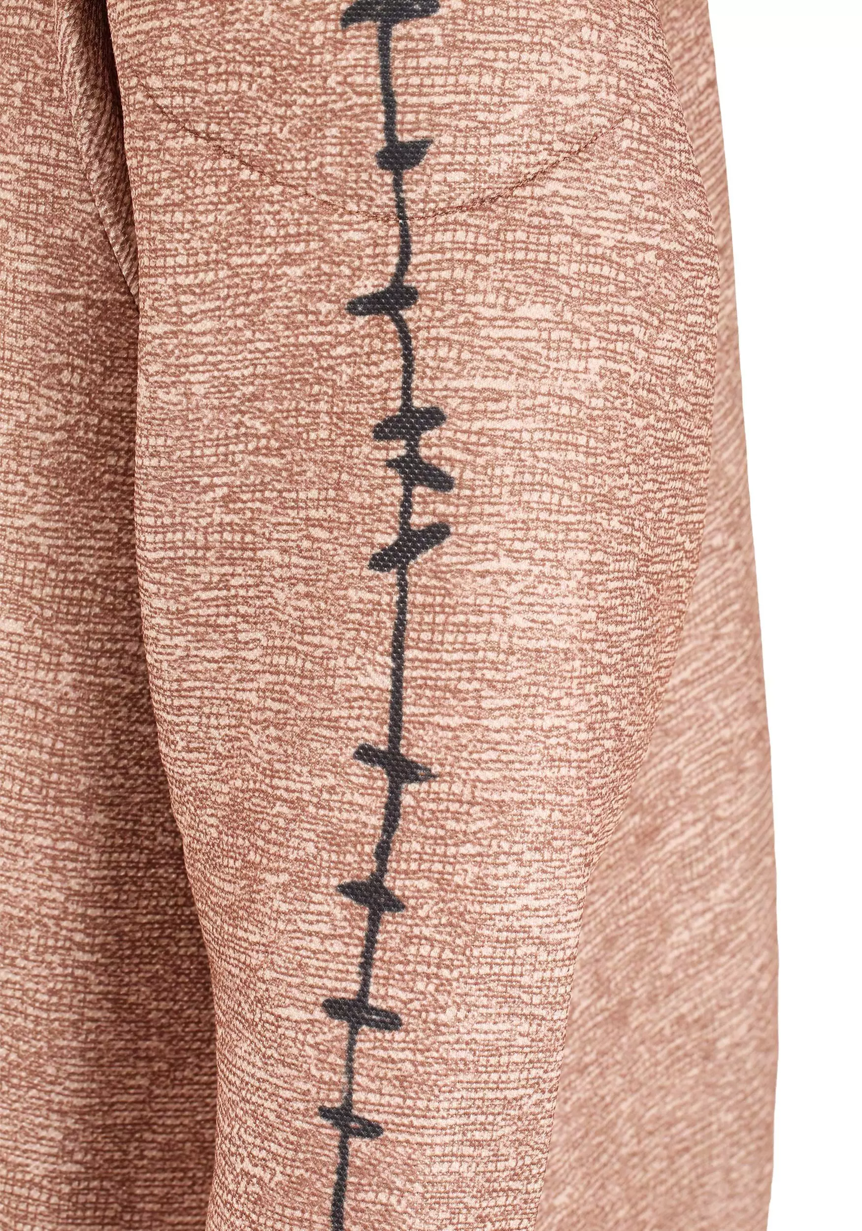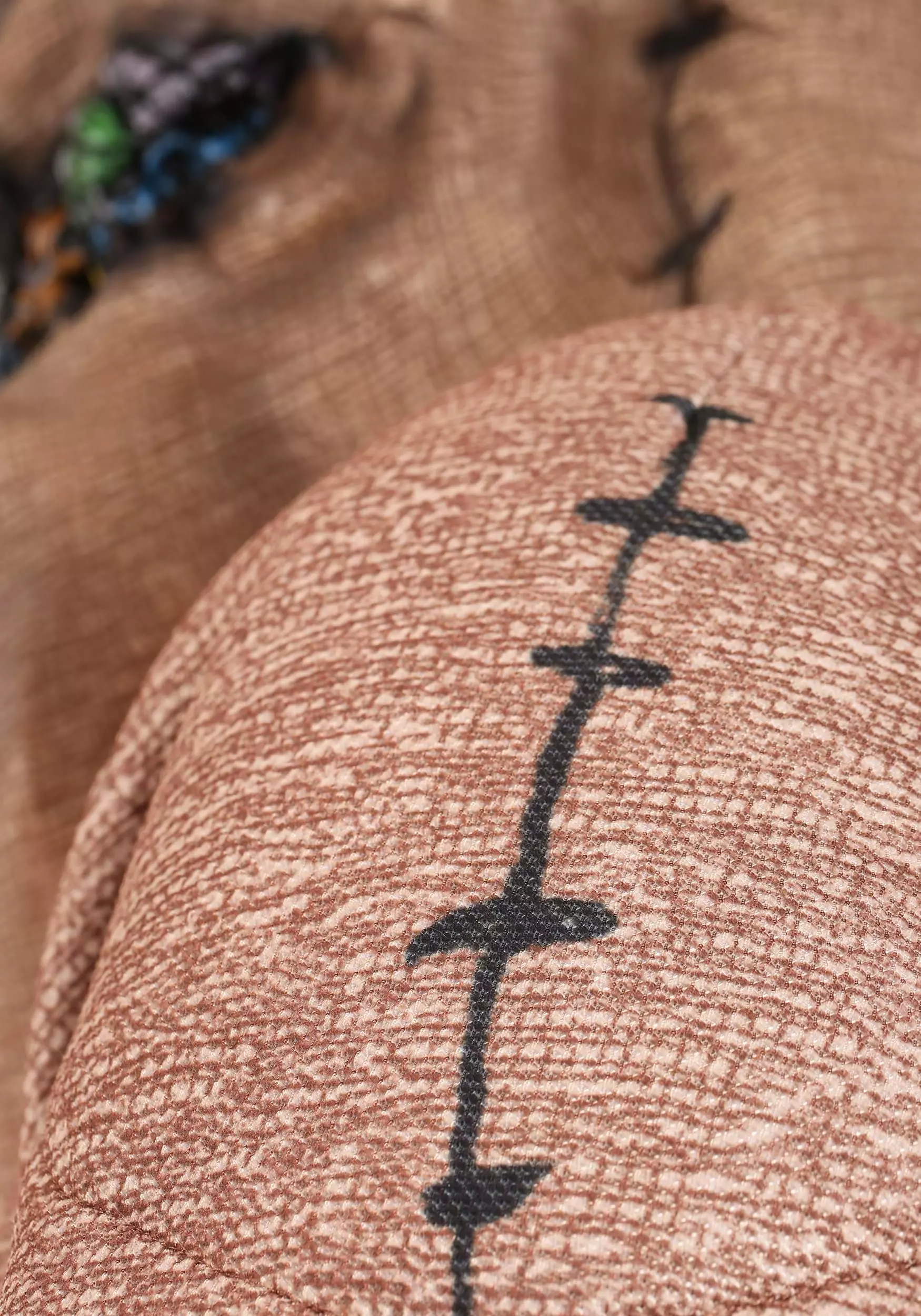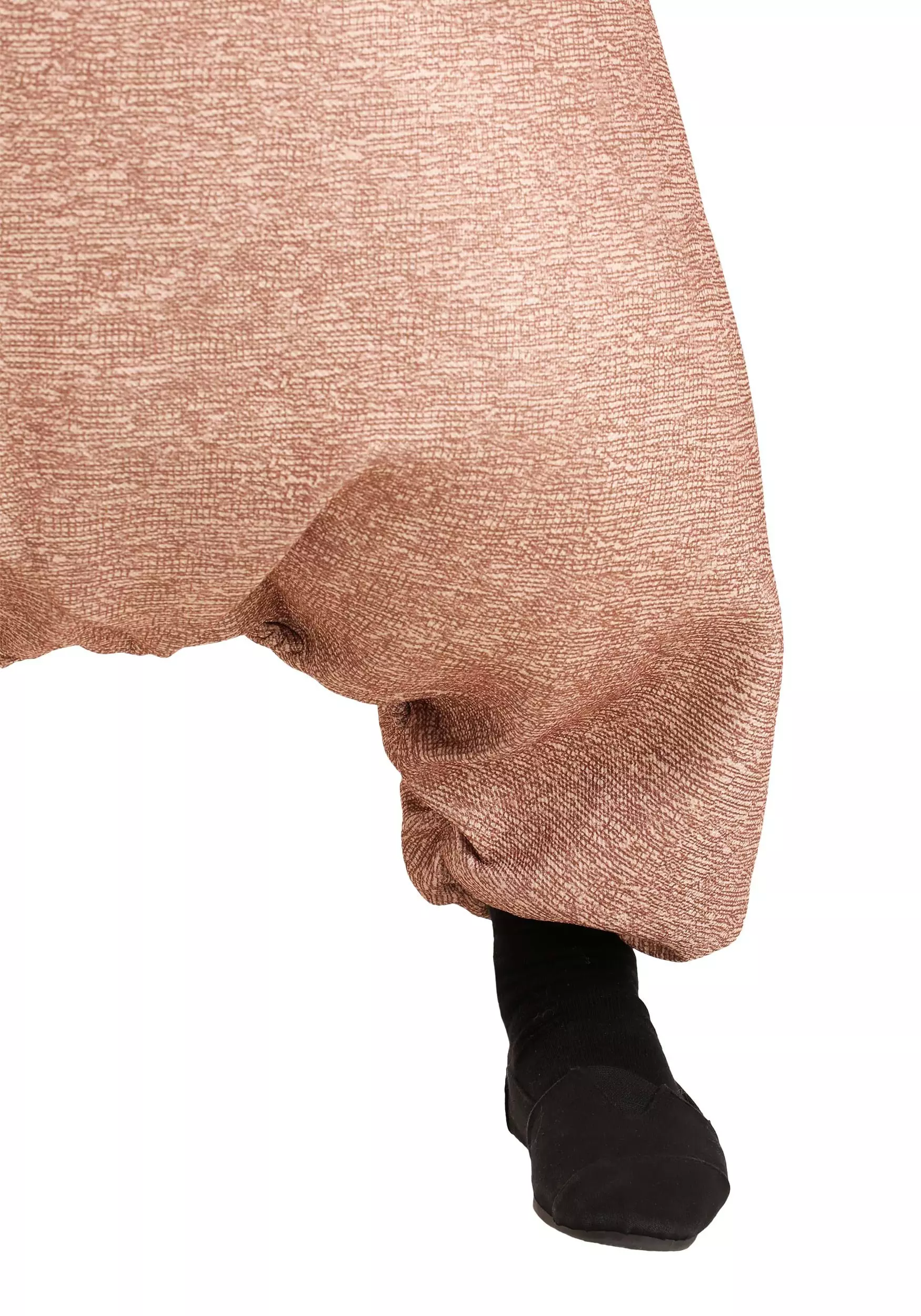 - Suit is foam-backed fabric w/ all-over print to look like burlap, with printed black stitching