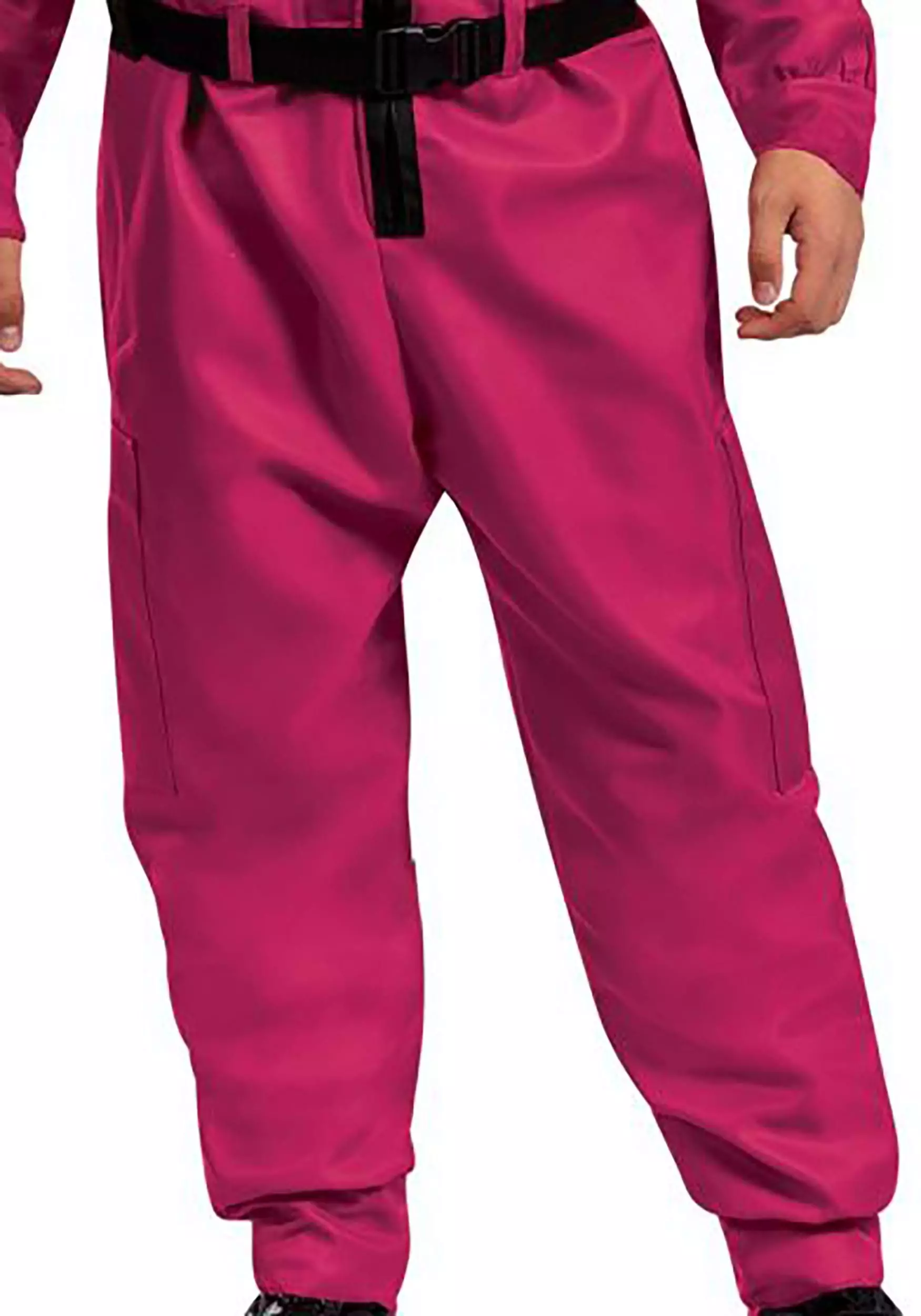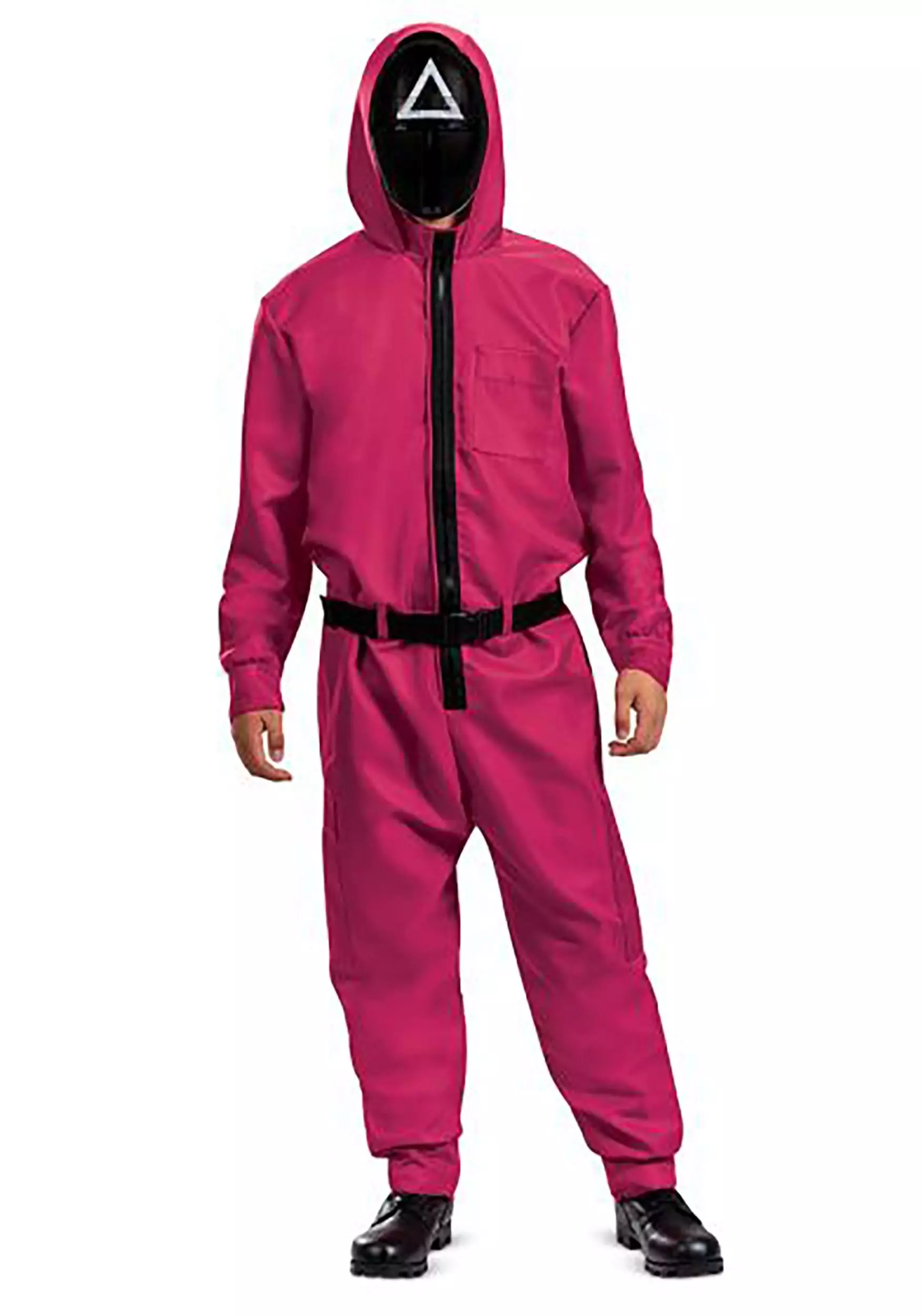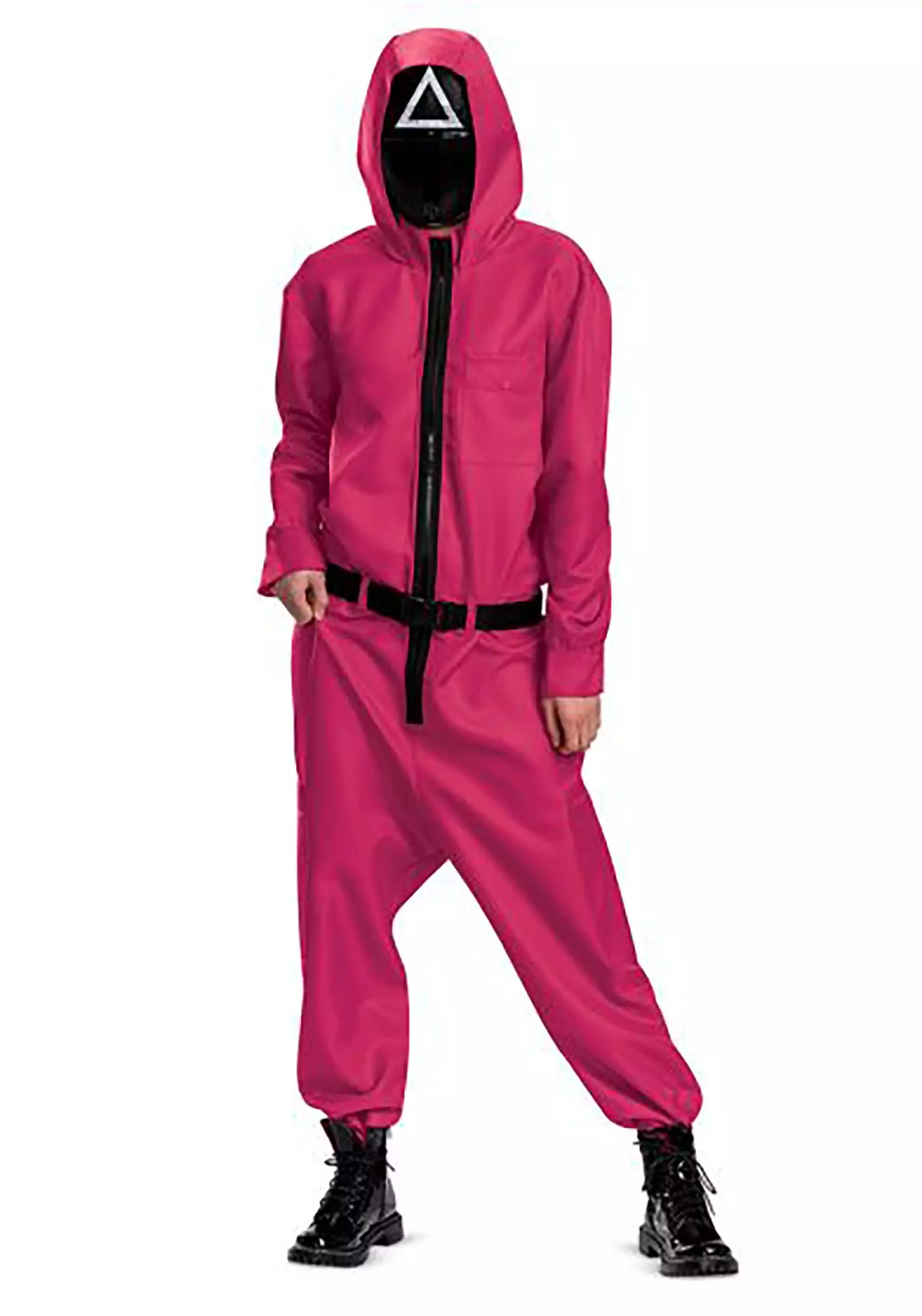 Deck yourself out in game-time glory with this Squid Game Triangle Guard costume. This officially licensed jumpsuit is a recreation of the red guard uniform worn by the middle-tier enforcers in the hit TV show. Step into the jumpsuit pants, fasten the front, and slip the triangle mask over your face to conceal your identity. Visibility can be limited in the Squid Game masks, so keep an eye out for any opportunity to advance. Just be sure you know the rules of the game!