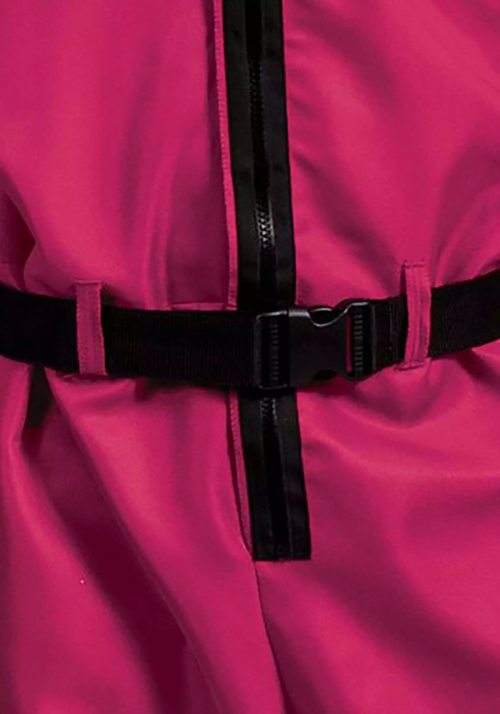- Polypropylene webbing belt threads through loops at waistline of jumpsuit, fastens w/ plastic parachute buckle