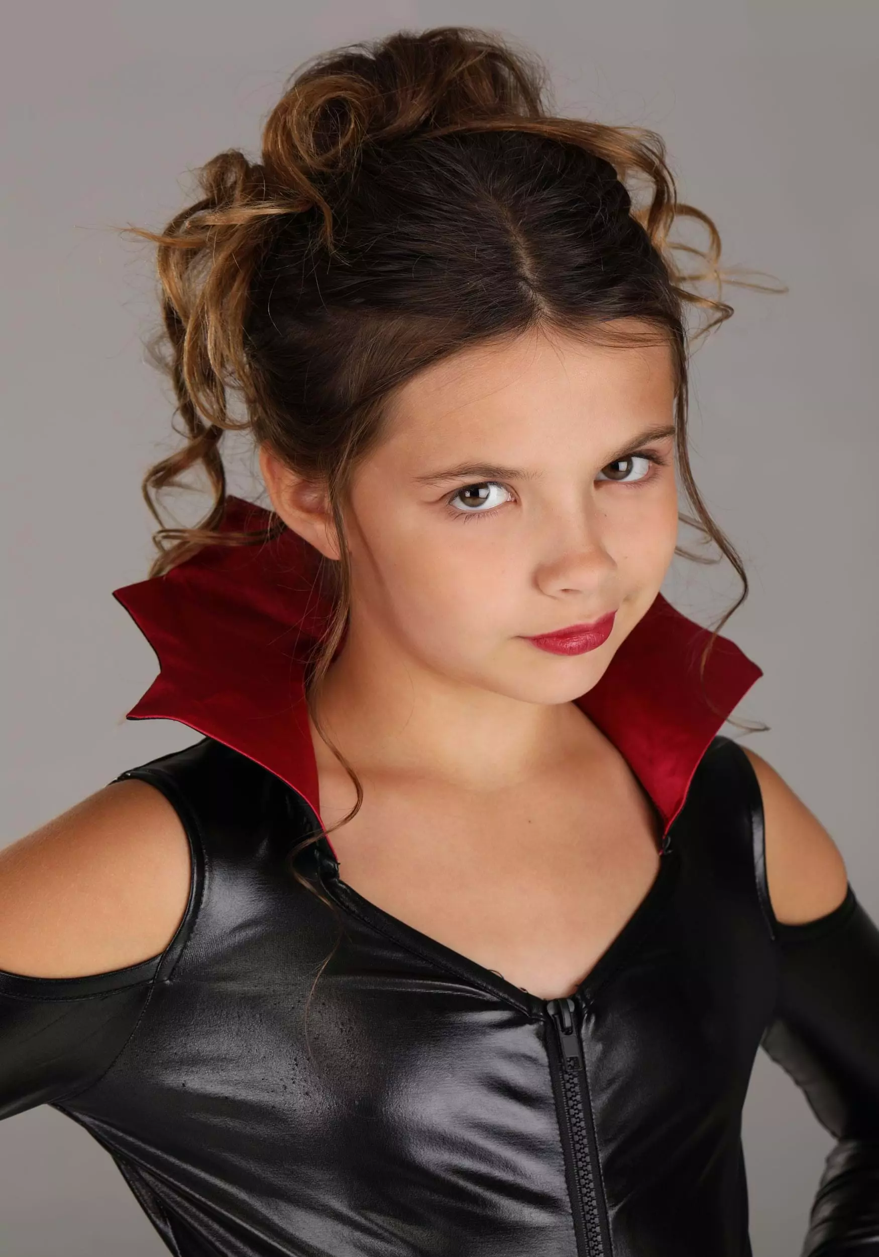Watch out, everyone: Here comes trouble wearing a Princess of Darkness Girl’s Costume! The cold-shoulder style black jumpsuit is made of a blend of polyester and spandex, and has a shiny finish. It zips up the front and features a stand-up red collar that looks like an old-fashioned ruff. Elastic finger loops are attached to each pointed sleeve cuff. An open-front crimson skirt is sewn to the back of the waist. Red reverse-scallop edging decorates the waist’s front.Â