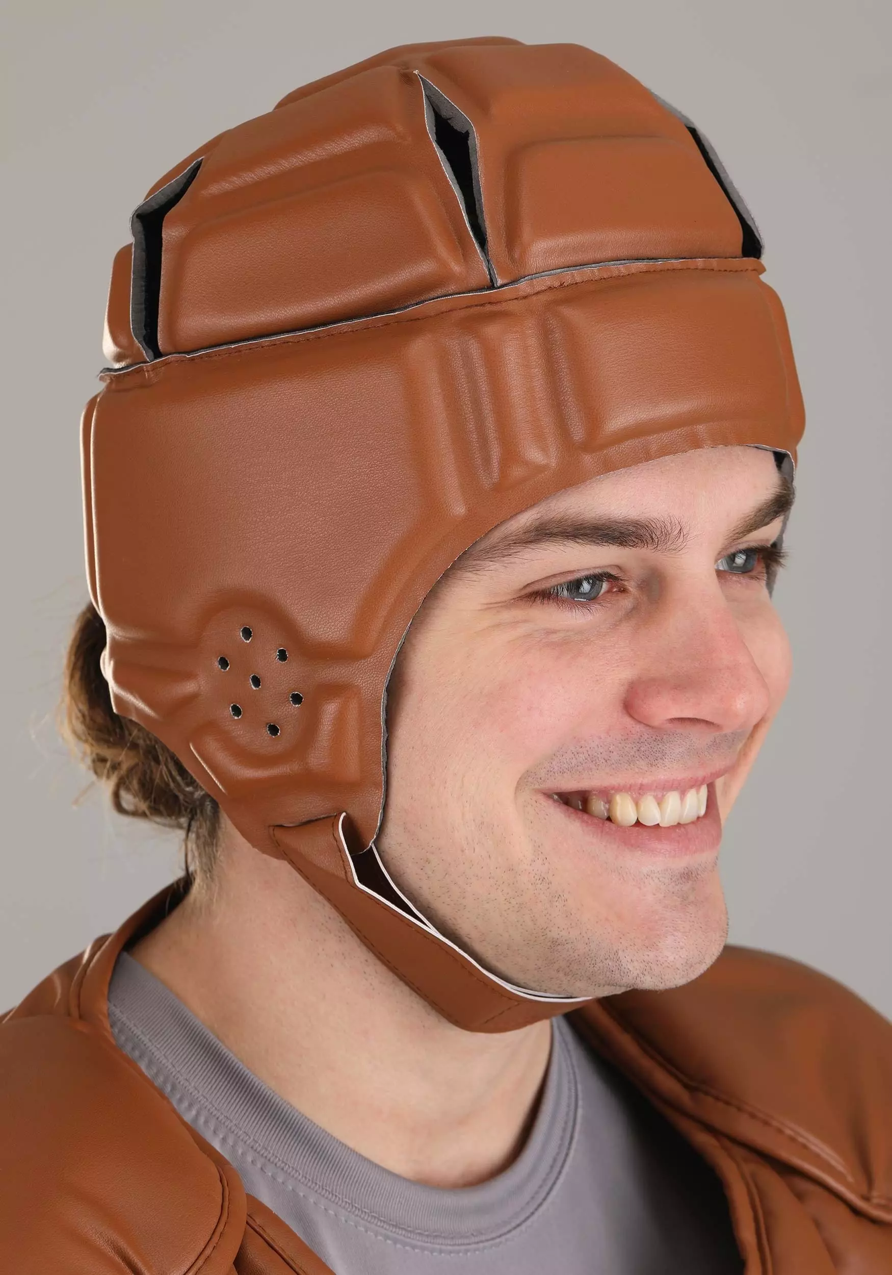 - Foam helmet has adjustable cord lacing at back, hook & loop fastener on chin strap
