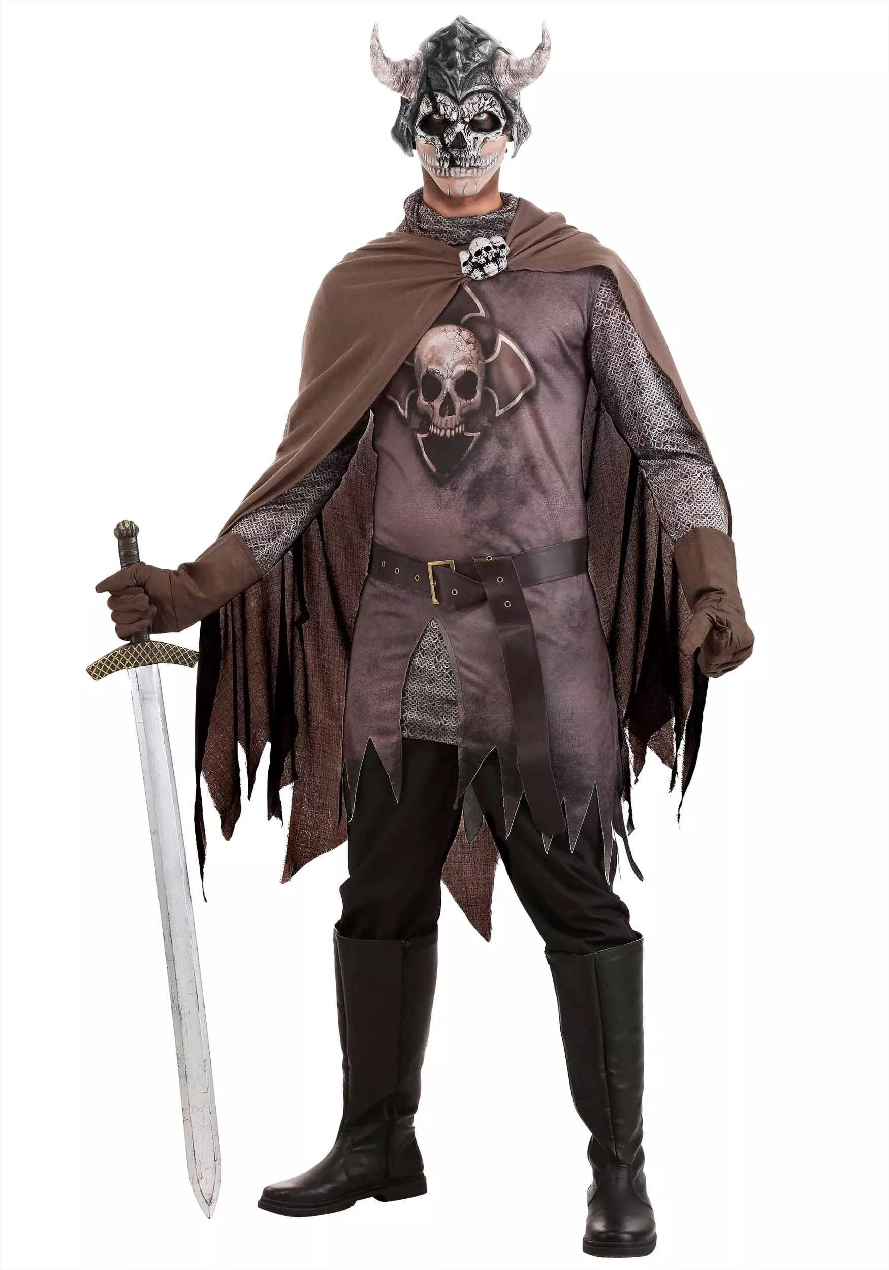 This Made By Us adult knight costume puts a ghoulish spin on the classic virtuous character. The costume begins with a tunic that has a skeleton emblem on the front. The sleeves are designed to look like chainmail armor. The belt is made out of faux leather material and adds a classic Renaissance style to the outfit. The cape fits over your shoulders and clasps into place with a skull-shaped brooch around the neck. Of course, you’ll want to hide your face from the world of the living and the included helmet is the perfect accessory for the job. The finishing touch comes in the form of brown faux leather gloves. Just slip them on to complete your transformation into the kingdom’s most nefarious foe!