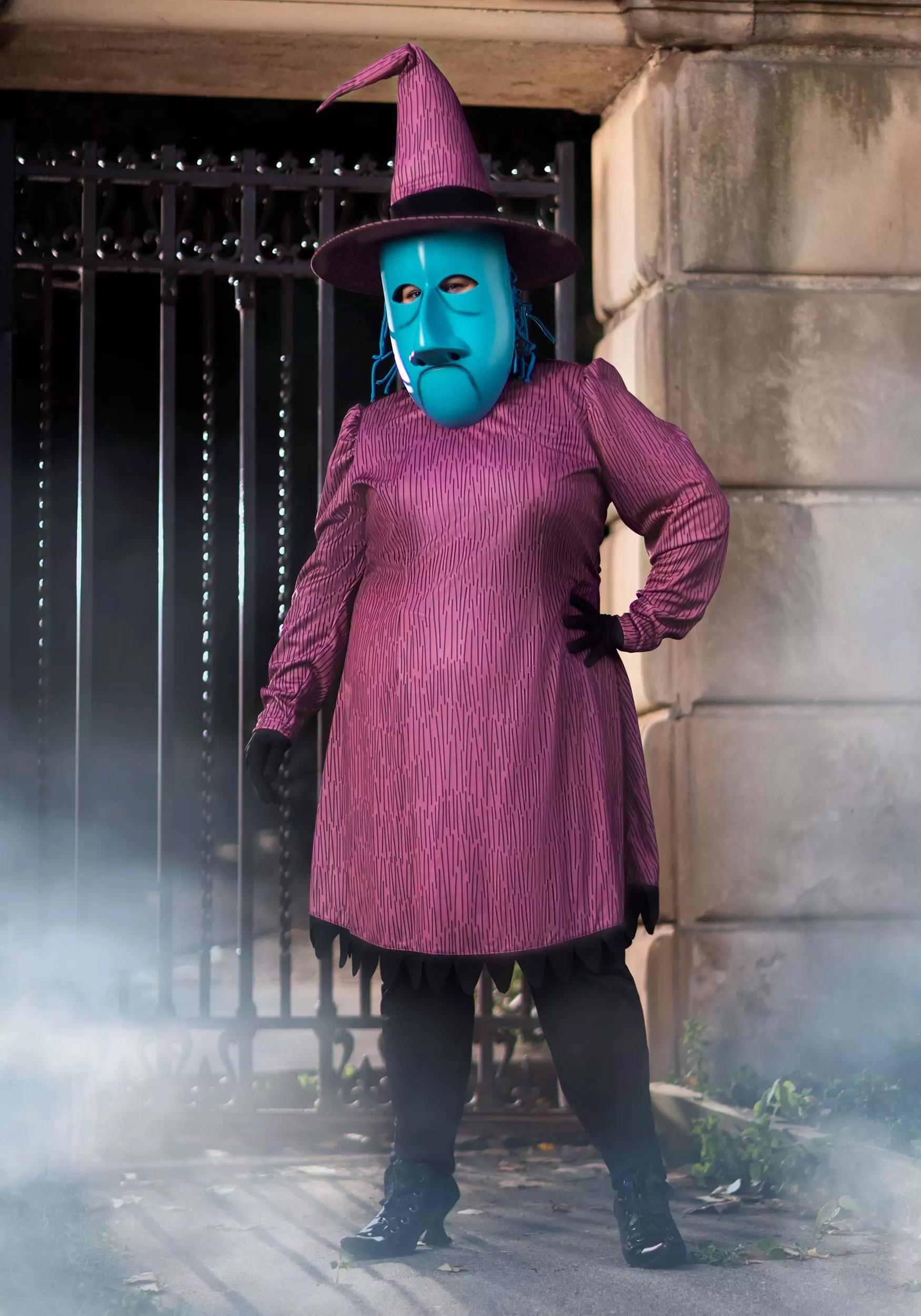 Angular details on the collar and hemline create an animated feel and the pointed hat and its bursting blue hair under the brim will have you cackling like a real Halloween Town witch! Slip on the mask to hide your smile and wear Shock’s scowl. Before long you’ll know all of Halloween’s secrets!
