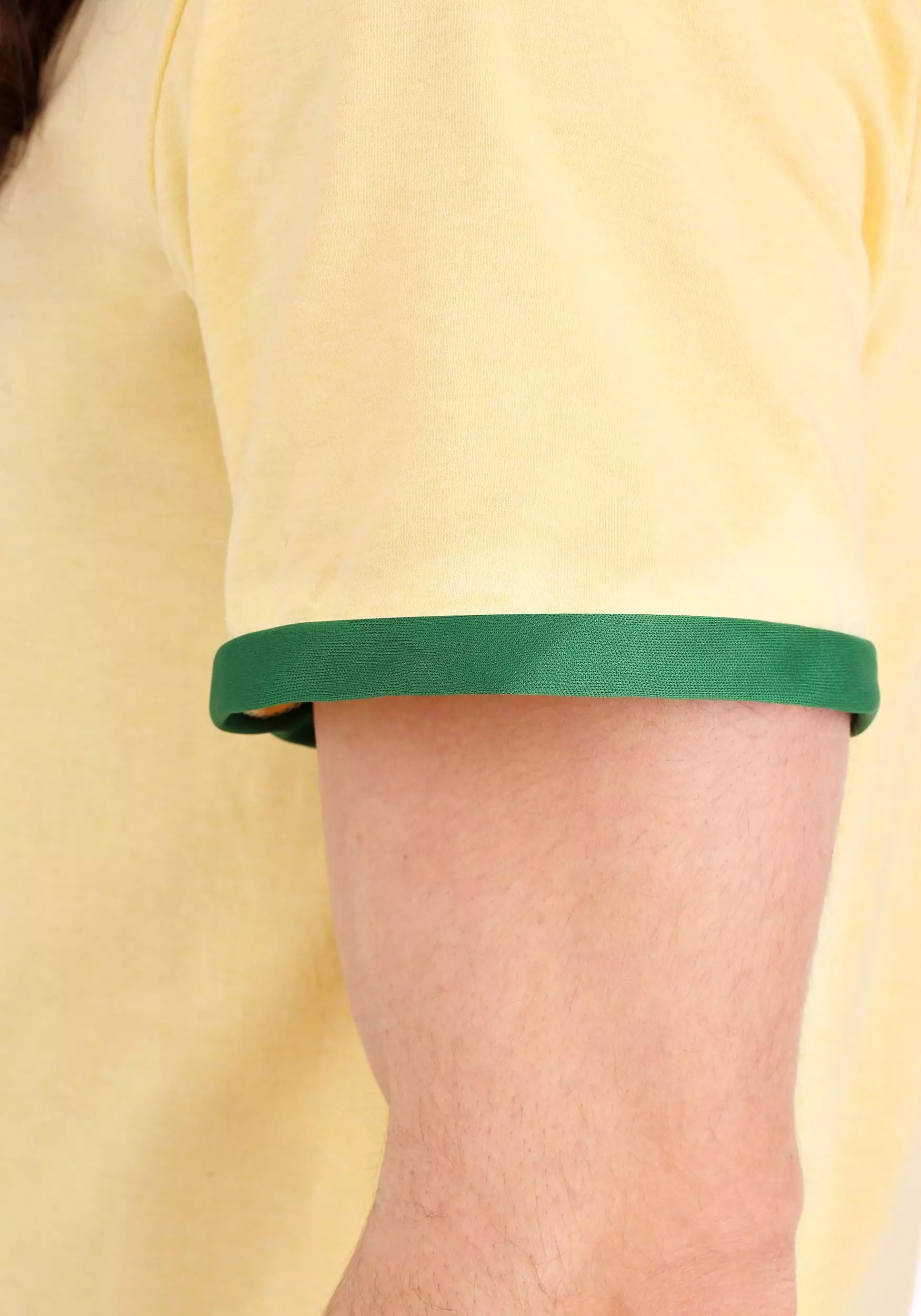 - Yellow polo shirt has a V-placket w/ green trim