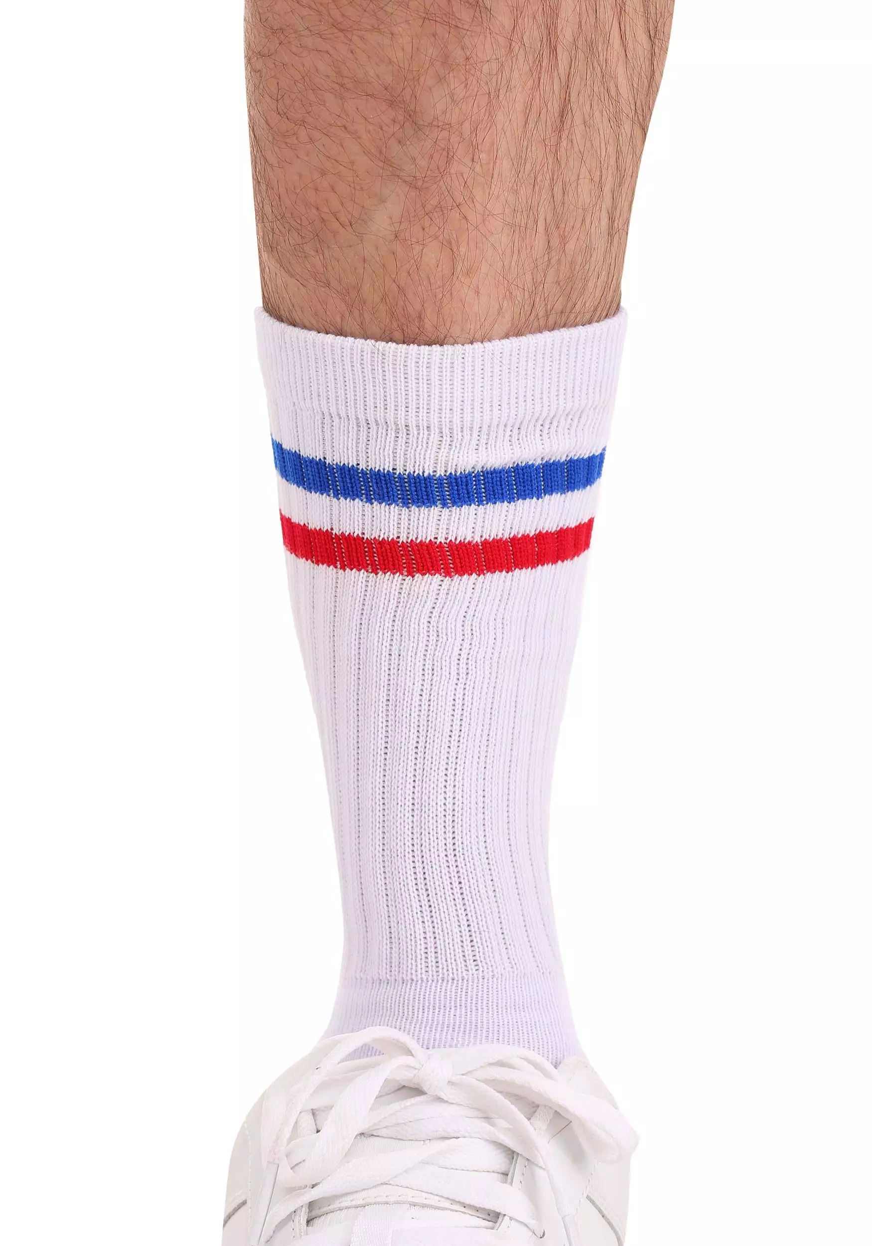 - White crew socks have red and blue stripes