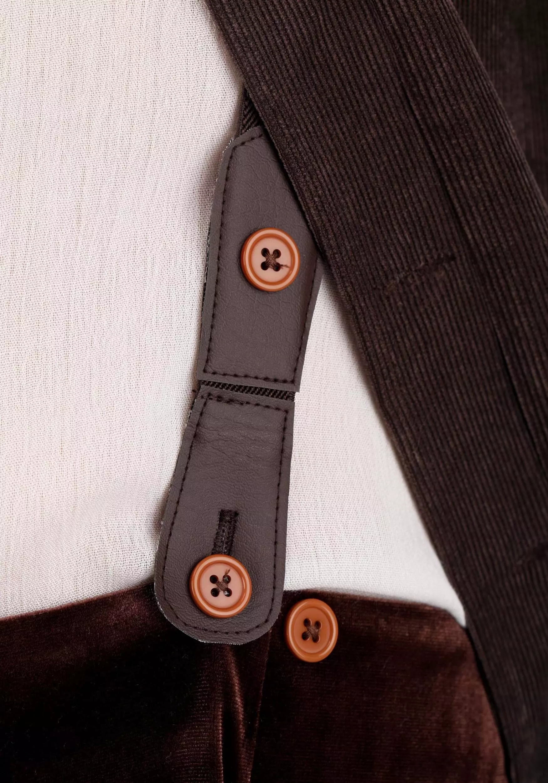 - Elastic suspenders are sewn to back waist of pants, attach to front waist with buttons