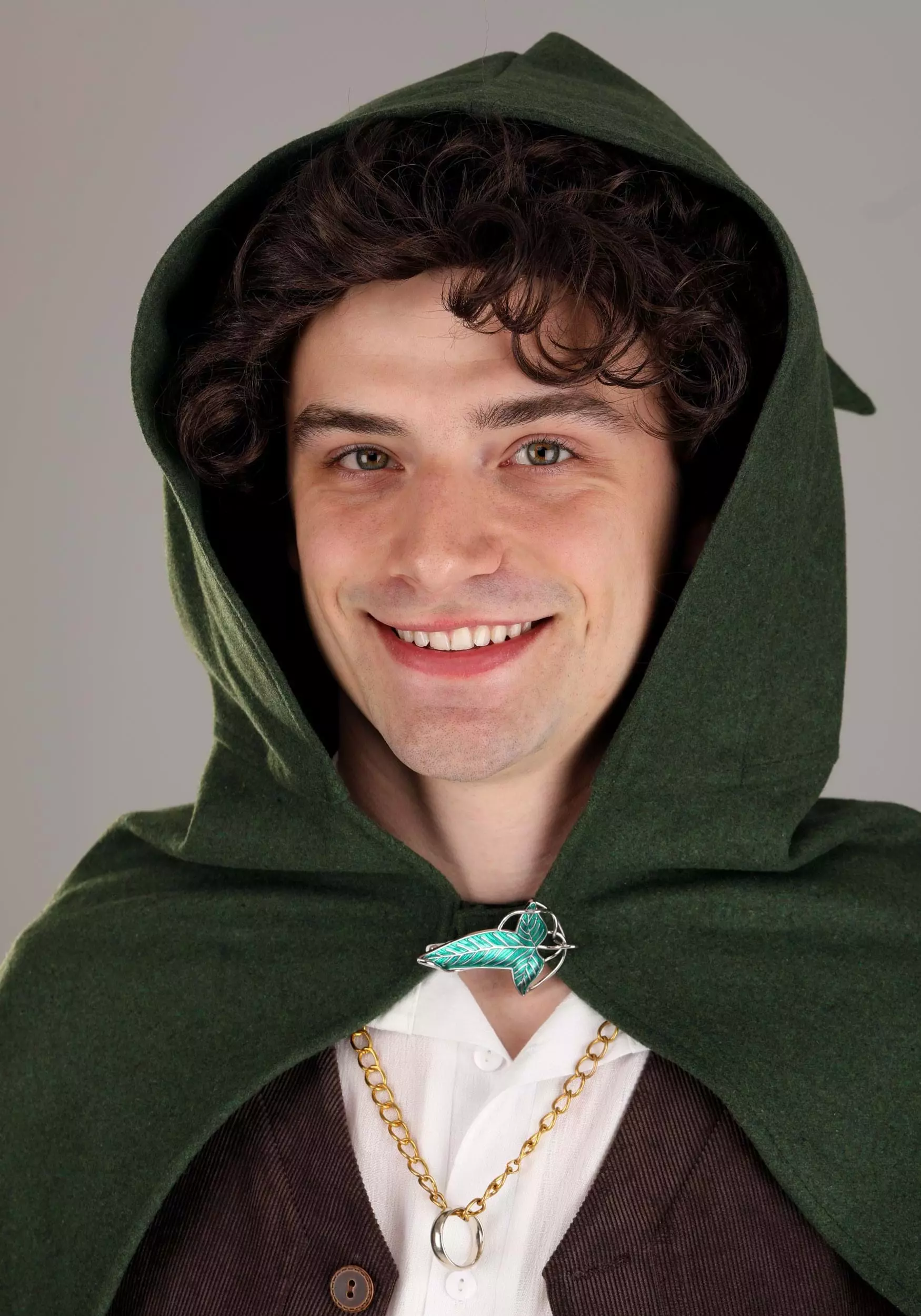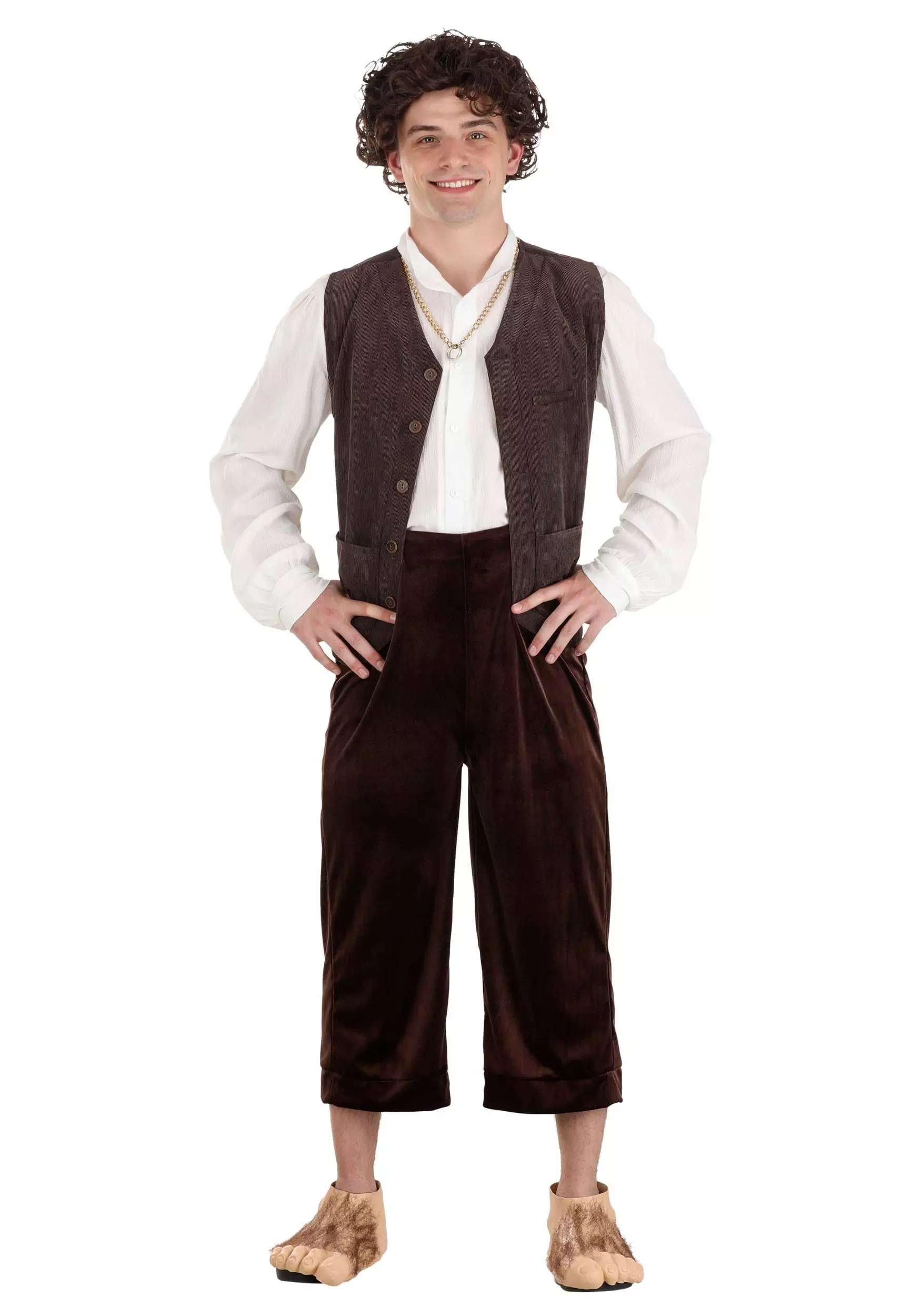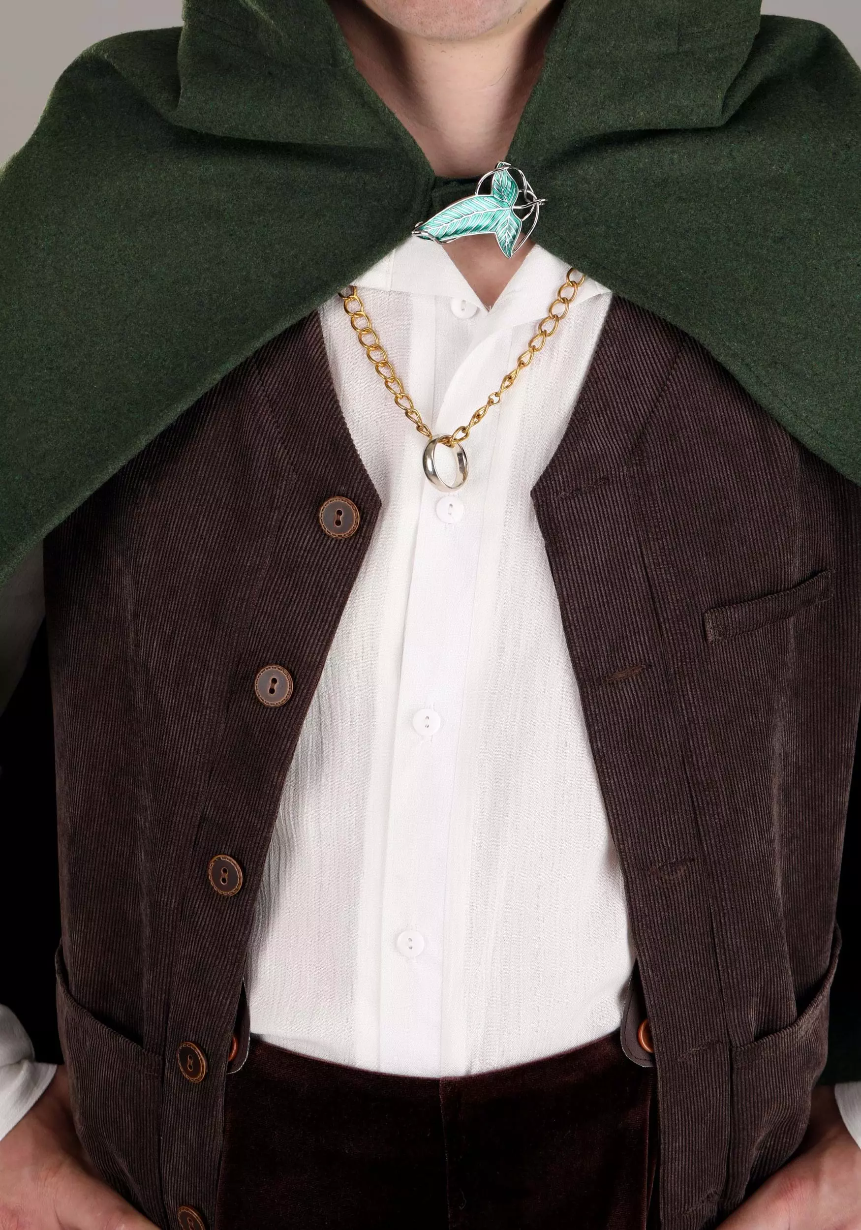 Bravely lead the Fellowship to Mount Doom and face down Sauron when you wear your officially licensed Lord of the Rings Frodo Costume for Men! The exclusive outfit looks like the one Frodo wears in the movies, and includes a travel-ready off-white shirt that goes under a brown vest. Fasten the suspenders to the soft brown velour pants to keep them in place while you fight off Orcs. The green cloak fastens with hook & loop fastener behind an Elvish leaf pin. Add the Hobbit feet as the final touch!Â