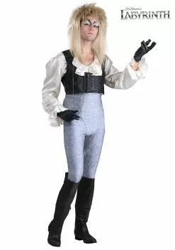 Of course, the true identity of the Goblin King is always up for grabs. Our faction of goblin designers have their hands on the goods and are delighted to offer you this officially licensed Labyrinth Jareth Costume. Begin with this long-sleeved shirt with the deepest of V-necks and flowing lightweight lapels. The vest is a black vinyl shoulder corset with exquisite details. The pants are tight male leggings with a high waist and skinny ankles. But, the real magic comes from the foam and elastic codpiece that channel the full Bowie might. Call on the full might of the Goblin King with a Jareth Wig and magical orb accessory and you won’t even need to steal any babies!