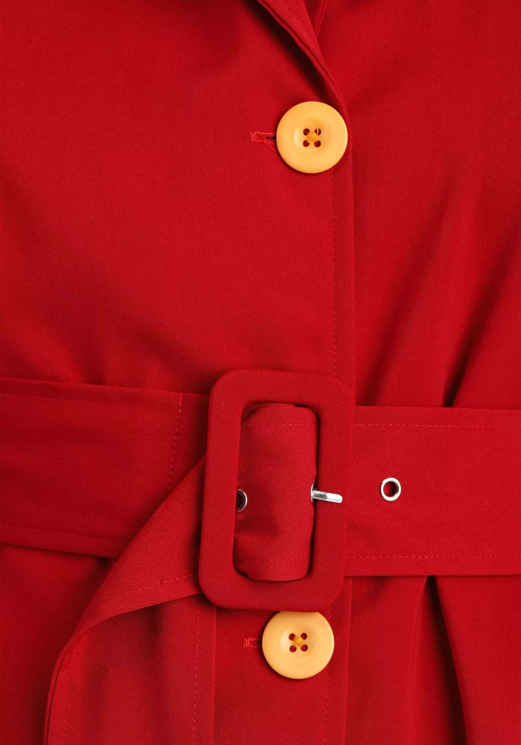 - Belt is same fabric as coat, w/ fabric-covered buckle & metal eyelets