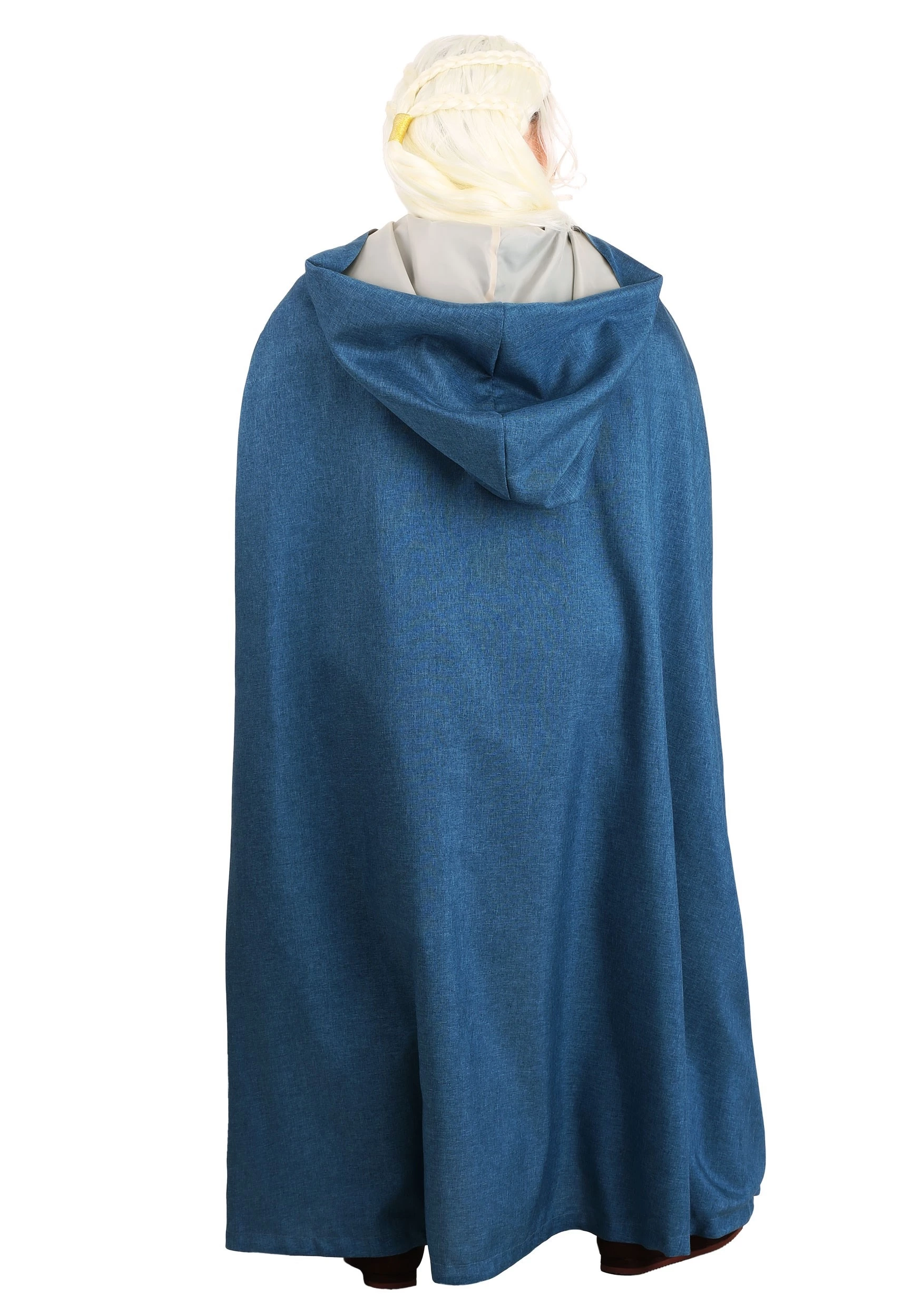 Rise and become the Dragon Queen in this exclusive costume. This Made by Us look was crafted in-house by a team of designers that knows just how brave a queen can be! This ensemble includes a blue dress that zips up the back and pairs perfectly with the buttoned traveler’s pants. The long cape has a metal latch and a massive hood. Who needs a coronation when you can crown yourself with this lovely wayfarer’s look?Â