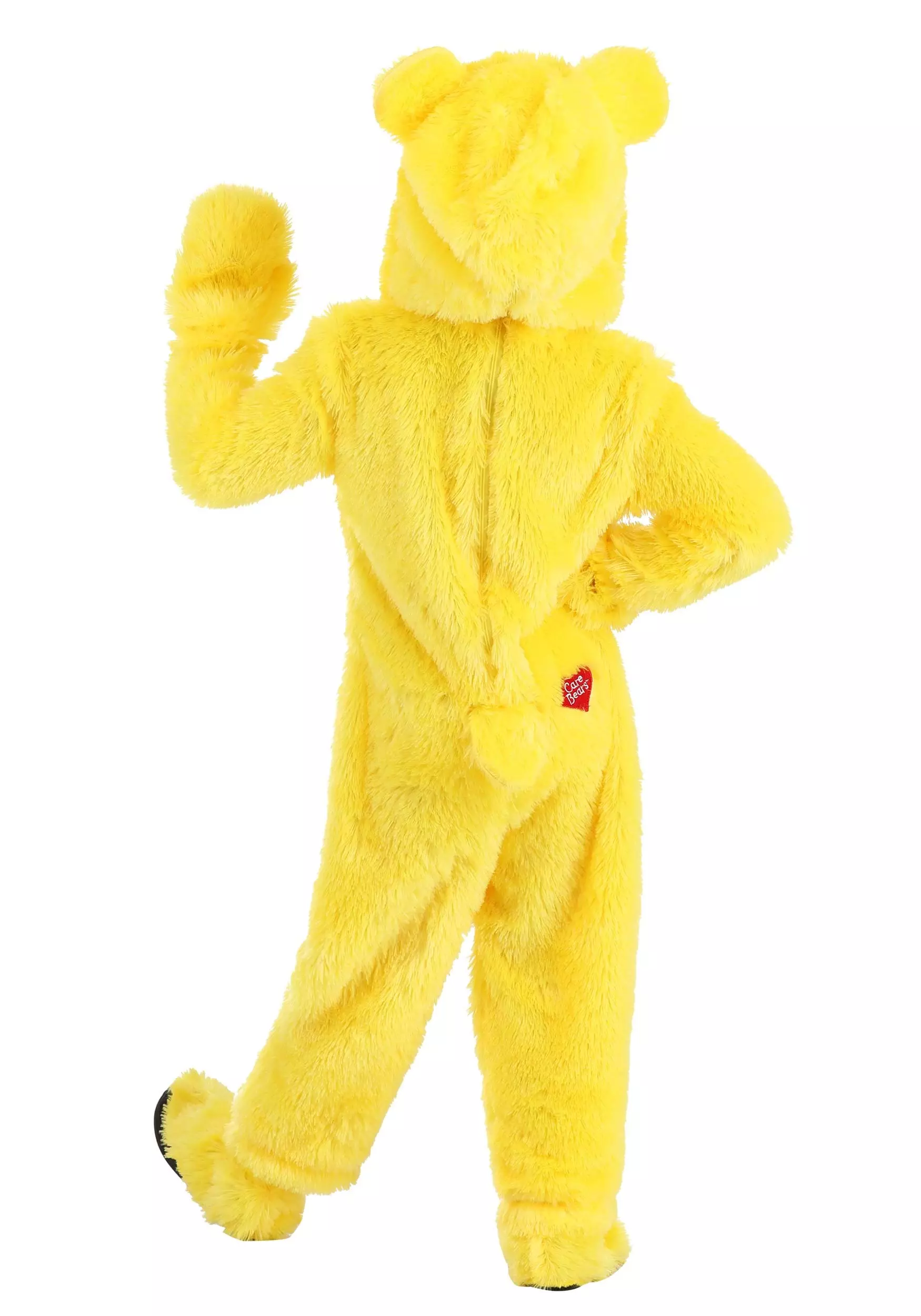 A long-sleeve jumpsuit with attached mittens and a hood sets the base of the look. The mittens flip back, giving the wearer full use of their hands, while the hood ensures Care Bear facial features and ears can’t go missing. Funshine’s belly badge is embroidered on the front, and the Care Bears logo is featured on the back next to an attached tail. A zipper down the back makes dressing simple, while slip-on shoe covers complete the look without sacrificing practical shoes.
