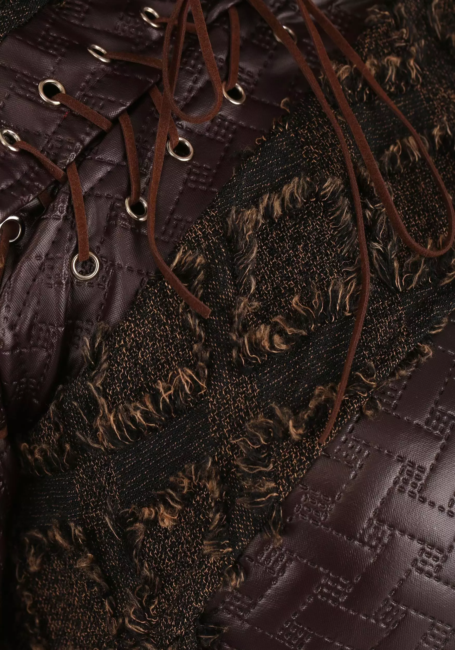 - Jacket has decorative rawhide cord lacing at center front and attaching sleeves to bodice