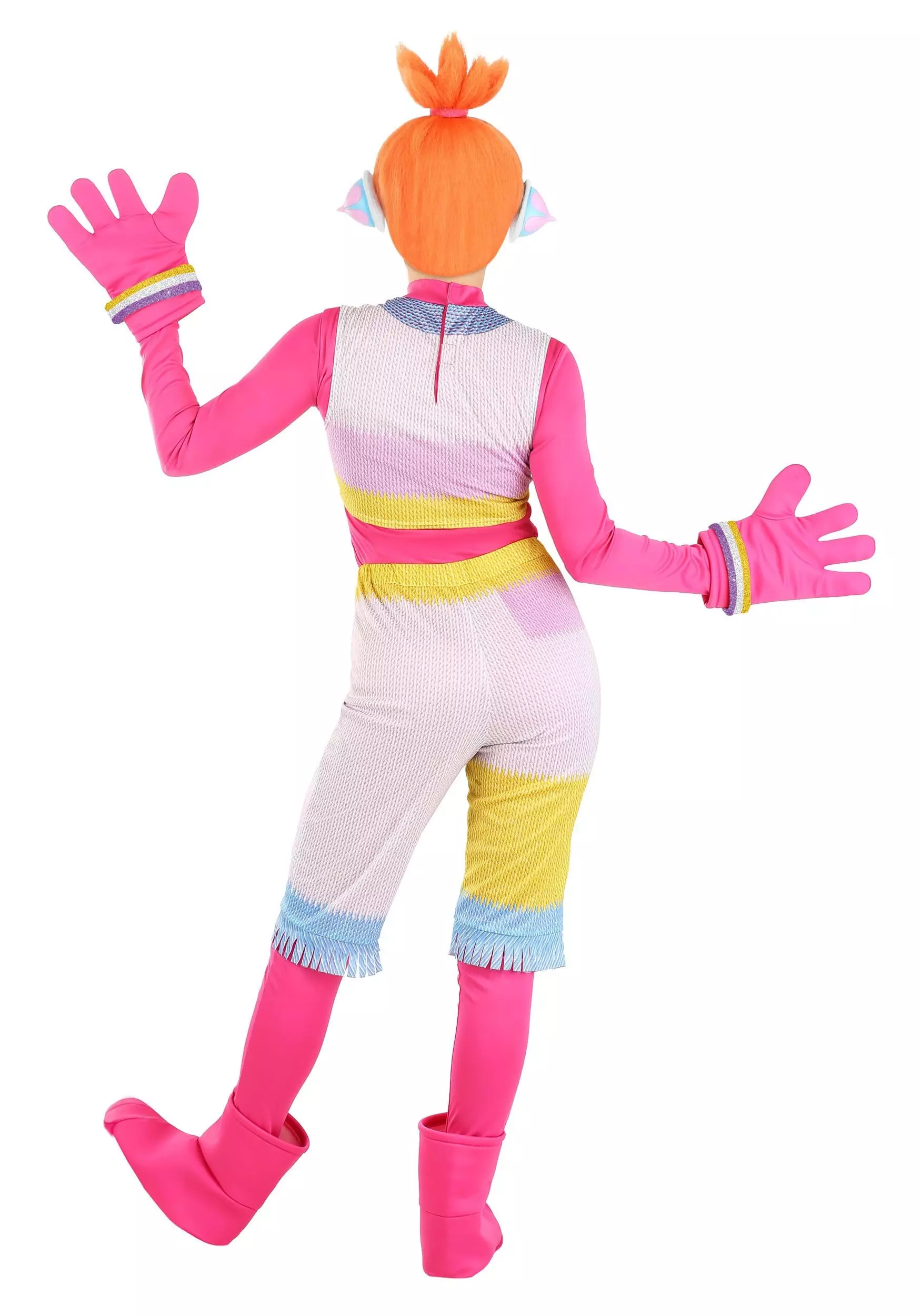 Draw attention to your DJ knowhow with this officially licensed Trolls Women’s DJ Suki costume! A stylish striped crop top and colorful fringed shorts give you DJ Suki’s signature look that has an almost seventies-style retro appeal. A glittery “wishstone” graces the navel, just like Suki’s. Hot pink boots and gloves with colorful attached bracelet bands complete the look. Suki’s bright orange ponytail under a glittery pair of headphones show that you’re ready to mix and beat-match with the best of them!