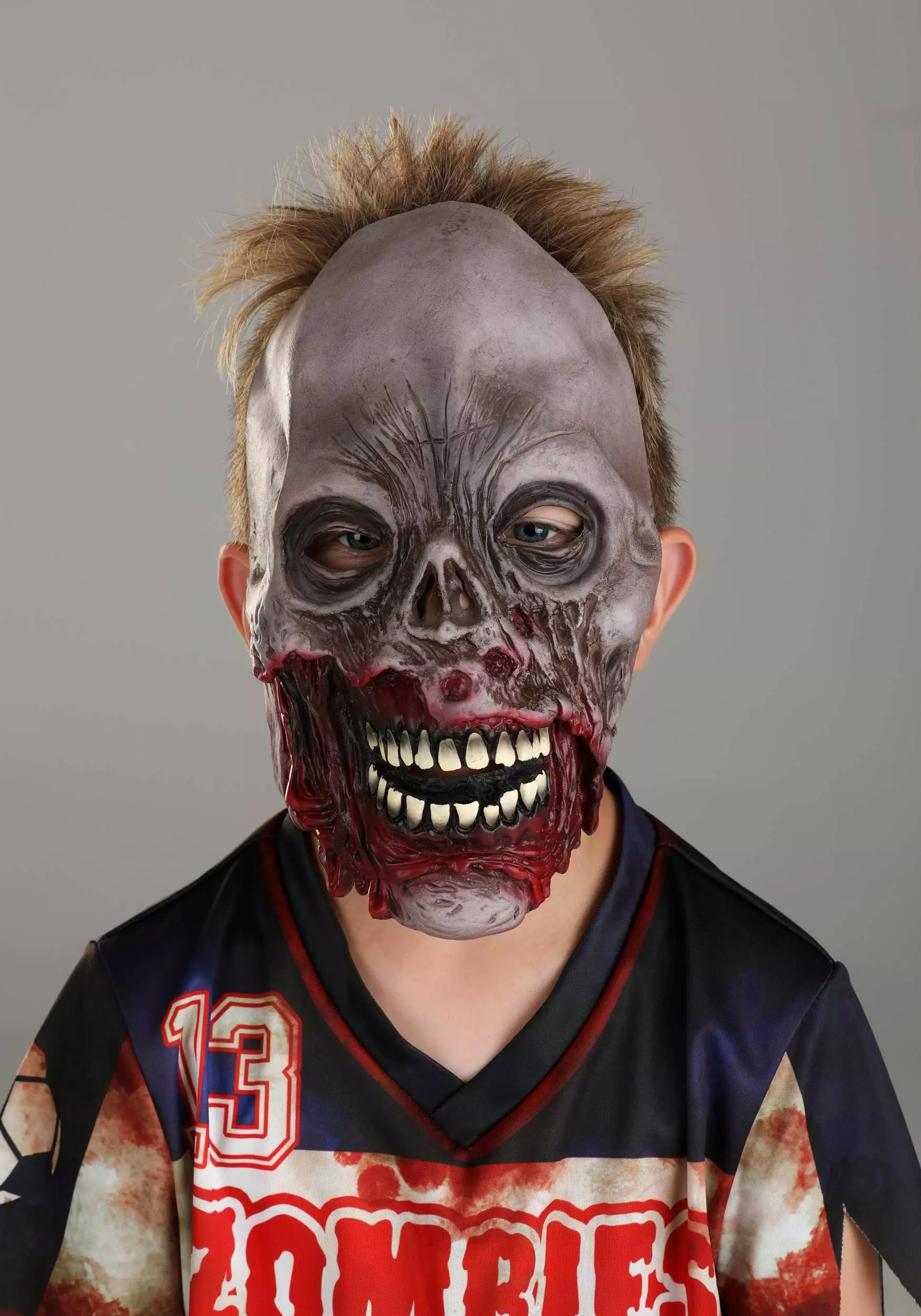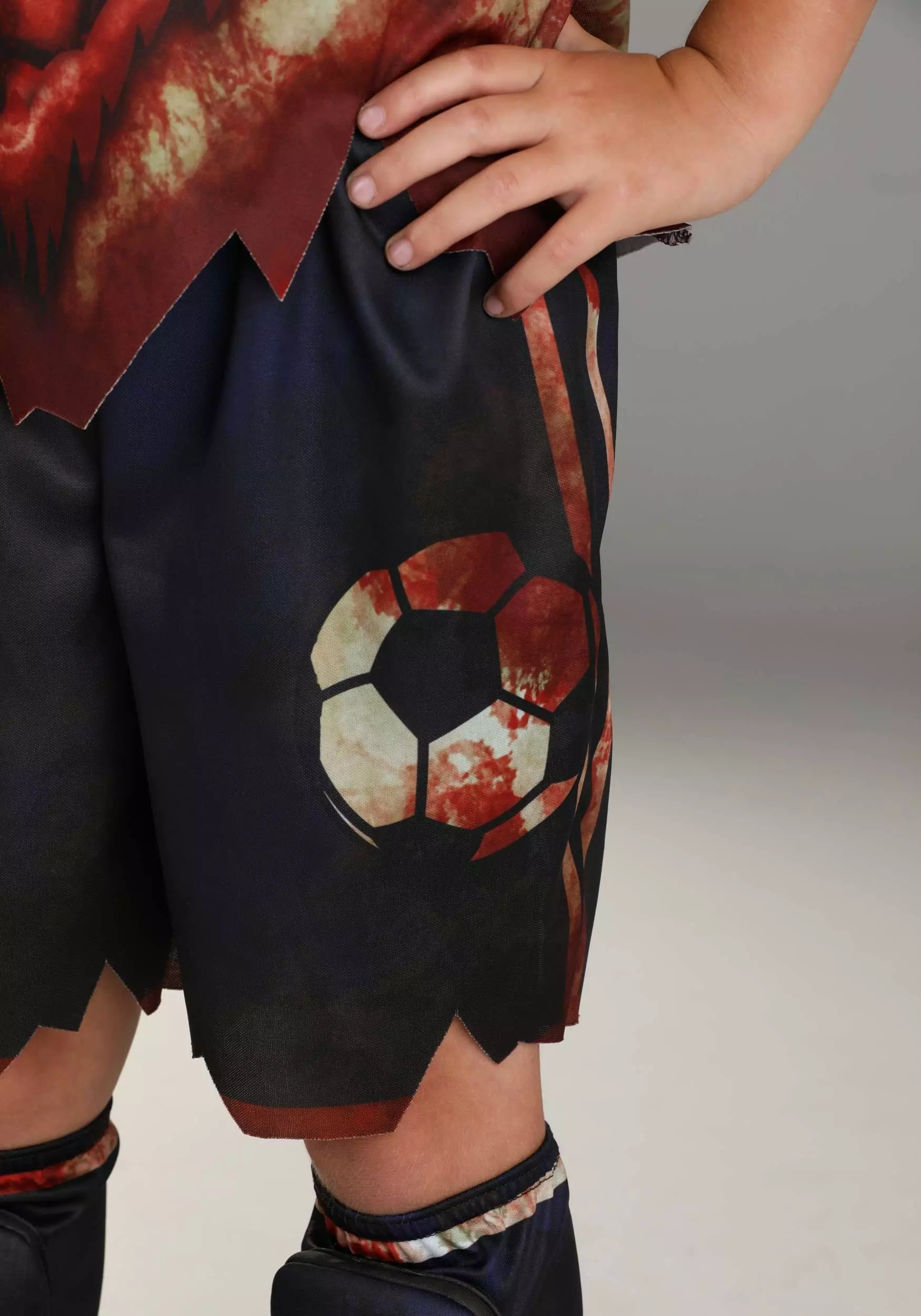 Making sure you are dressed right for any occasion is very important, which is why we recommend setting yourself up with this Kid’s Zombie Soccer Player Costume. This “Made By Us” costume was put together by our hard working and careful artisans, so you will feel good about wearing this for years to come. The shirt, shorts, mask, and leg pads are what will make you stand out in any soccer team of zombies. You will feel ready for varsity when you have this set of high-quality gear, complete with the zombie team logo and your player number. The mask will make sure the opponents never forget who they are playing against and the bloody details all over the costume are the perfect way to intimidate them.