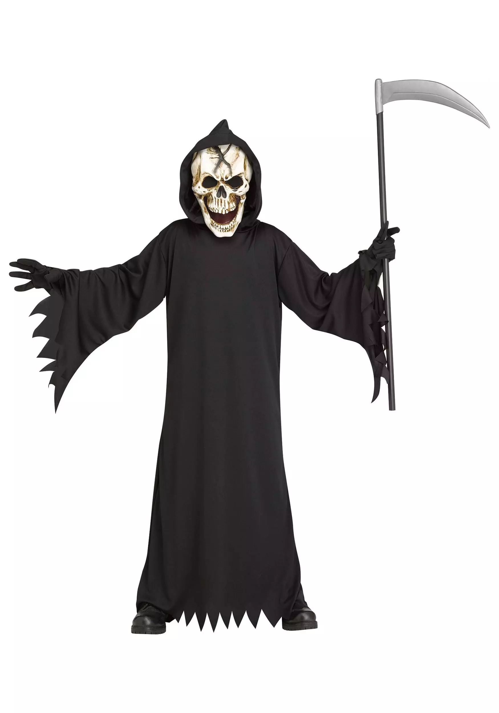 Serve up screams and jump-scares in this incredibly detailed Light-Up Kid’s Mutant Reaper Costume! The long black robe covers your street clothes and features jagged hemlines for a creepy effect. The hood pulls up over your hair and a haunting death’s-head skeleton face stares out of the opening! The mouth glows red for an extra-chilling touch.