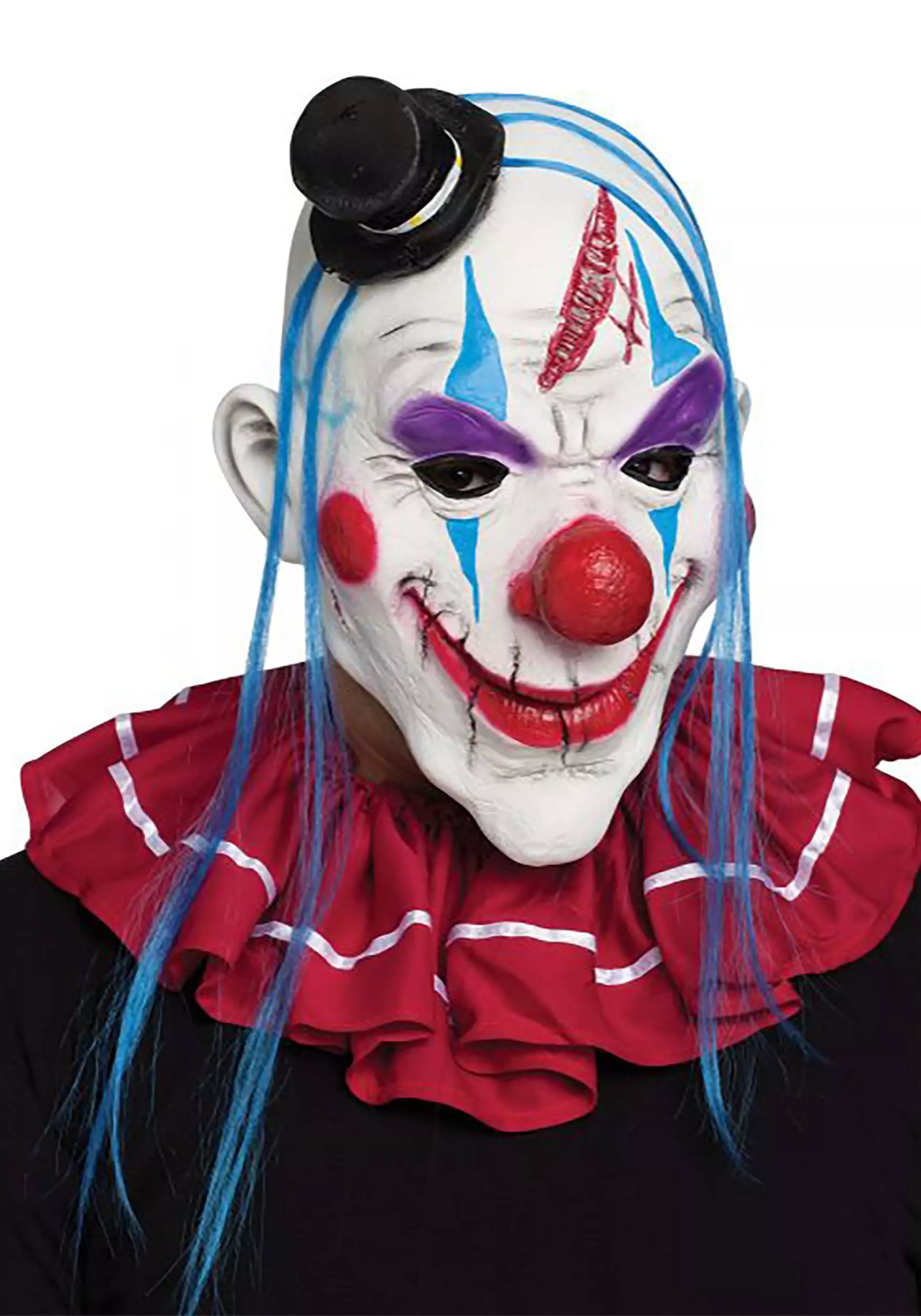 The beuaty of this creepy mask is it really doesn’t matter what you pair it with, though a clown suit would complete the look to perfection. It’s a latex molded full mask with holes at the eyes and nose, and the most deranged, menacing clown face we ever saw!