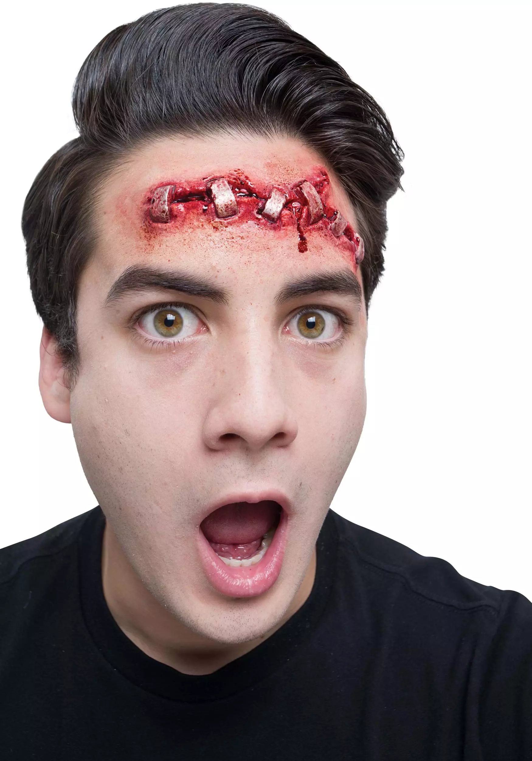 It’s alive!! This Franken Stitches Applique turns any outfit into a Halloween-worthy costume thanks to its ability to make you look like you’ve just been given a lobotomy in a mad scientist’s underground lab. The prosthetic resembles puckering red skin loosely stapled together with metallic-looking “staples.” Apply it using the makeup-grade adhesive of your choice (sold separately).Â