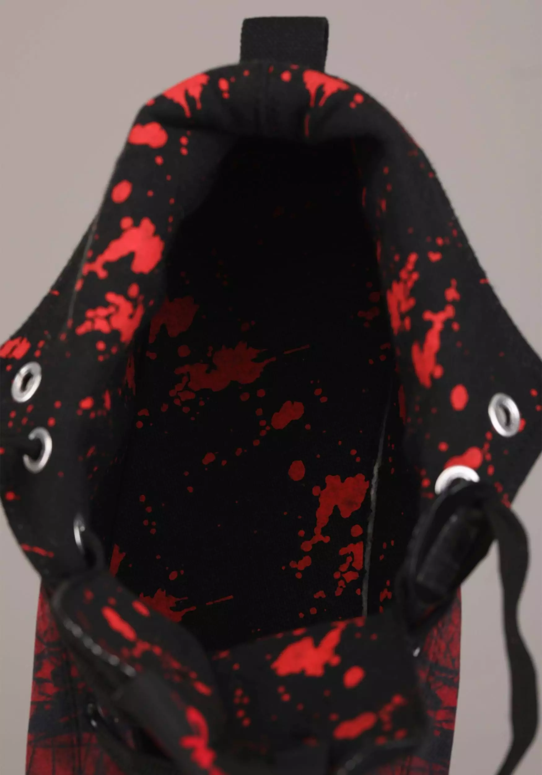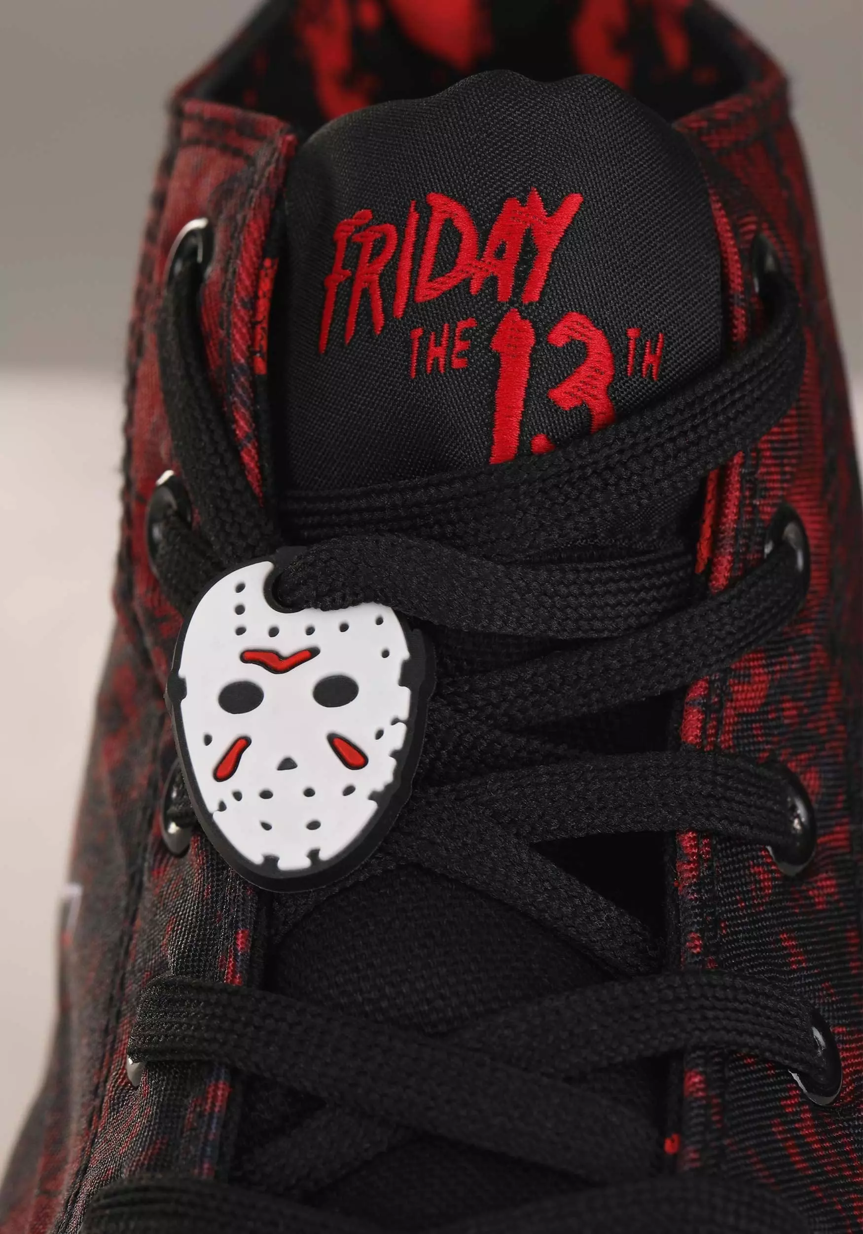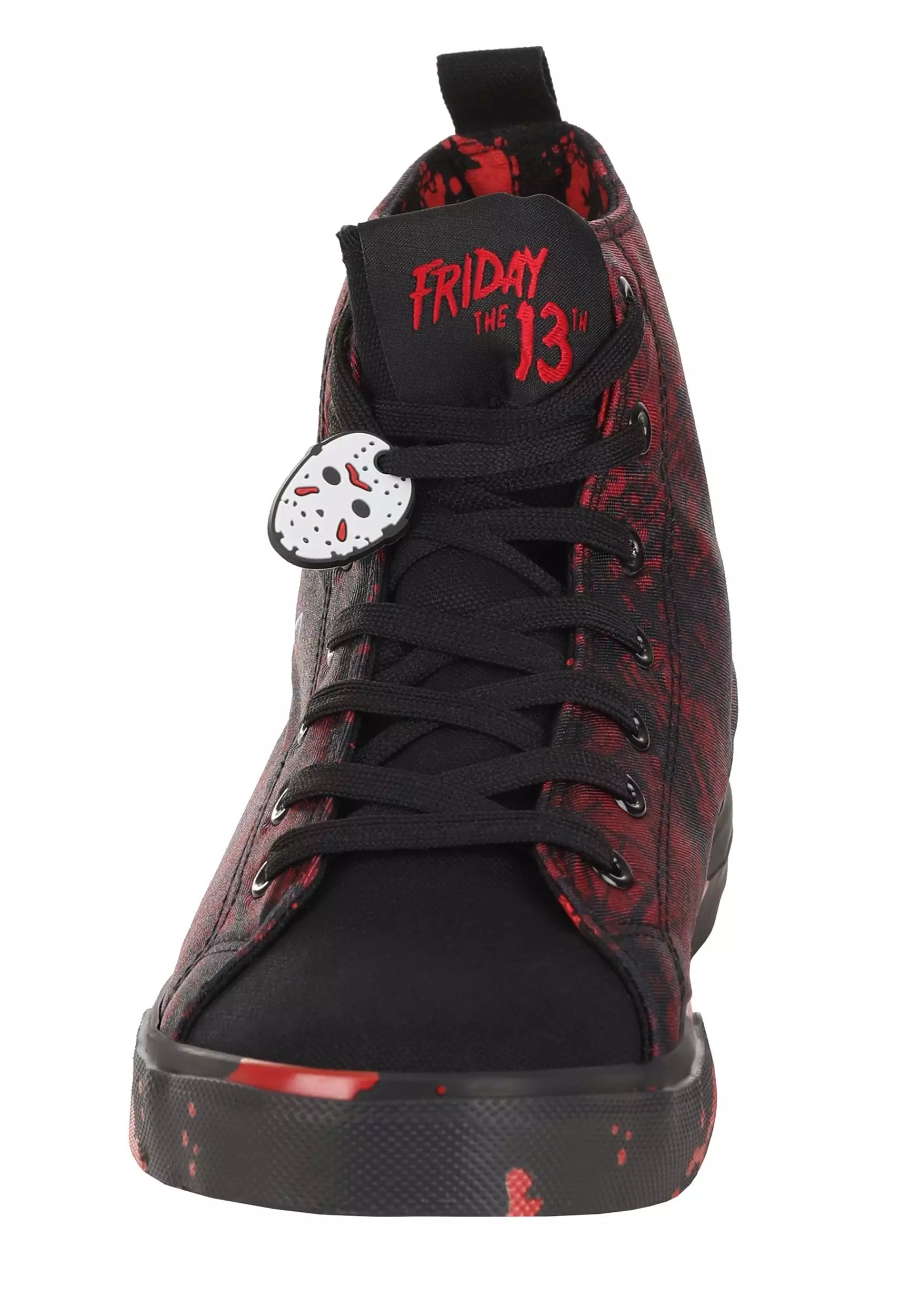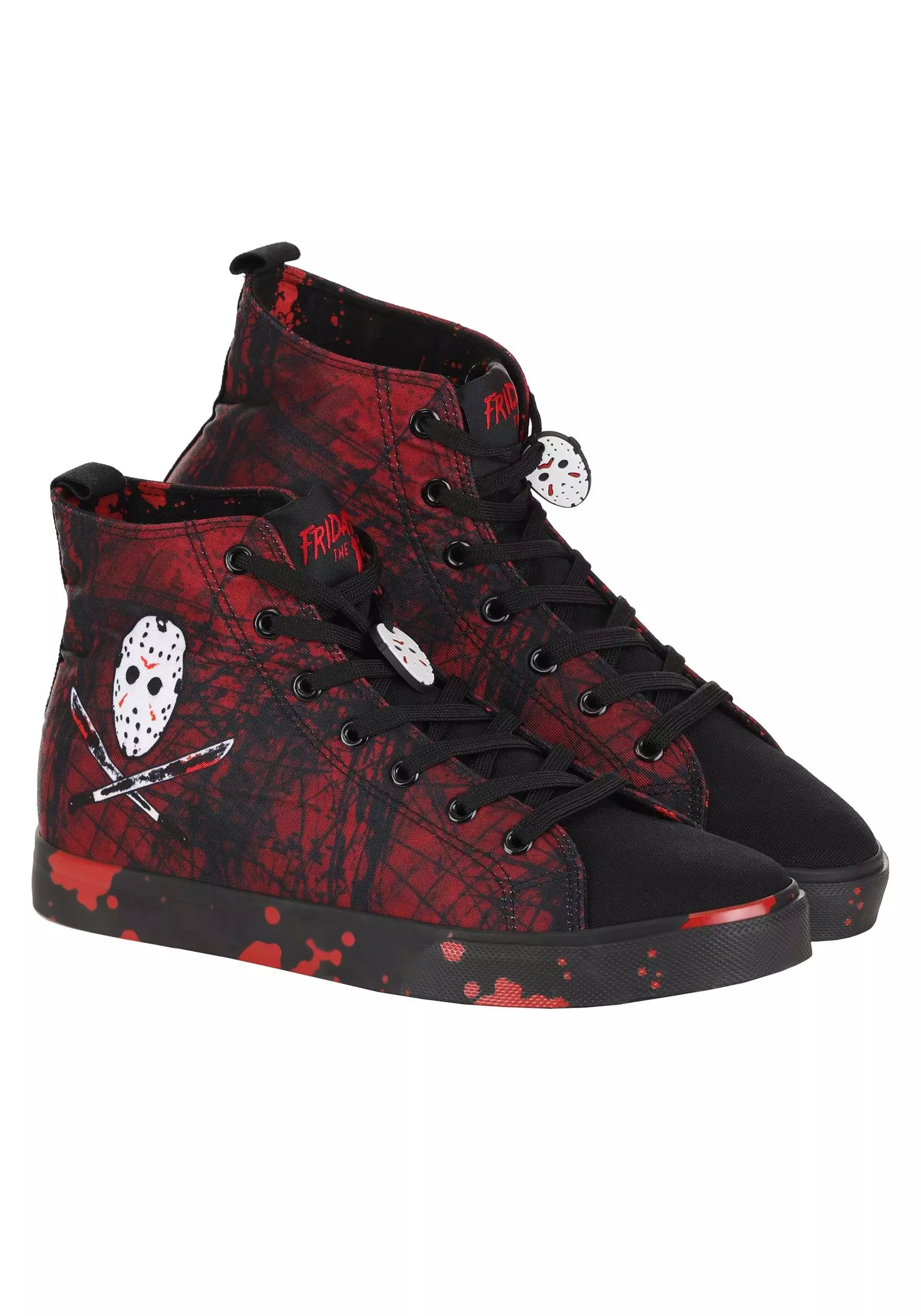 Jason Voorhees lives…on these officially licensed Friday the 13th Jason High Top Adult Sneakers! The uniquely awesome shoes have a red and black splatter pattern on the uppers and soles. Black laces criss-cross up the tongue, and the sides of the shoes are printed with an image of Jason’s hockey mask above crossed blades. A hockey mask charm dangles from an eyelet.Â