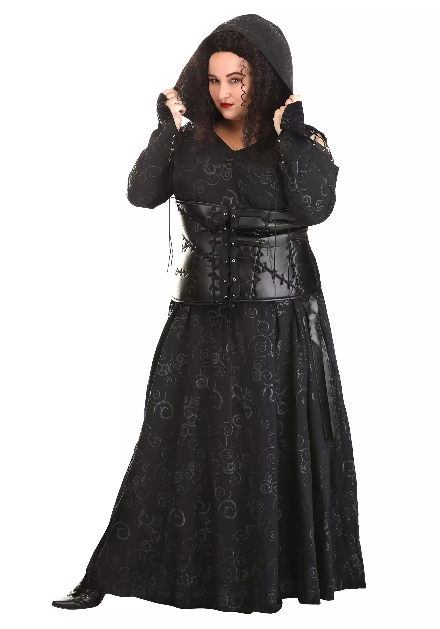 You have to admit, Bellatrix is so cool, in part because of how gothic and creepy she is! A replica of her signature look, this officially licensed costume is crafted in our in-house design studio, so we can preside over its construction, details, and transformative magic. This costume features a swirl-printed, pullover dress with a hood and long sleeves, as well as lace cording along the forearms. A foam corset sits on top, with an allover sewn appearance and front lacing. You’ll want to either get a perm or pick up a Bellatrix wig (not included), and don’t forget a wand — she’s practically powerless without one!