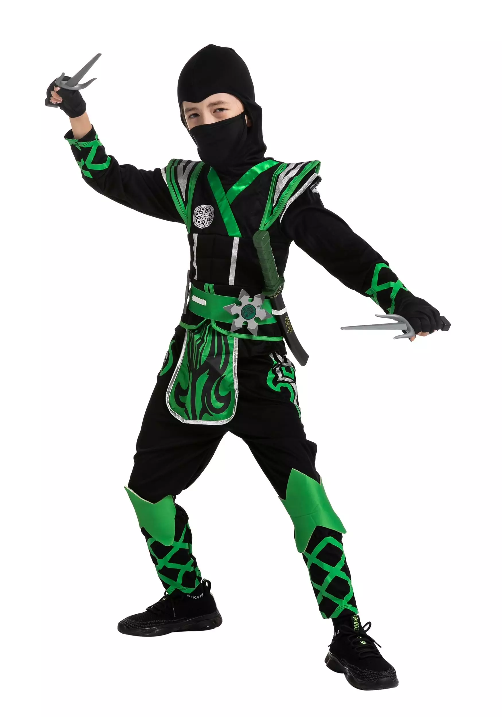 Show off your skills in an awesome Green Ninja Costume for Kids! The all-polyester outfit includes a pullover black shirt that features criss-cross creen detail on the sleeves and an attached hood that pulls up over your head. A sleeveless vest slips on over the top and zips up the back. Its printed with armor graphics and has faux armor plates over each shoulder. The matching green belt has a sash sewn to the front and features attached elastic bands that can hold your weapons. Green criss-cross detailed knee pads fasten with elastic bands, as does the black face mask. The costume comes with a toy sword and matching sword case, a pair of toy daggers, and a pair of foam throwing stars.Â