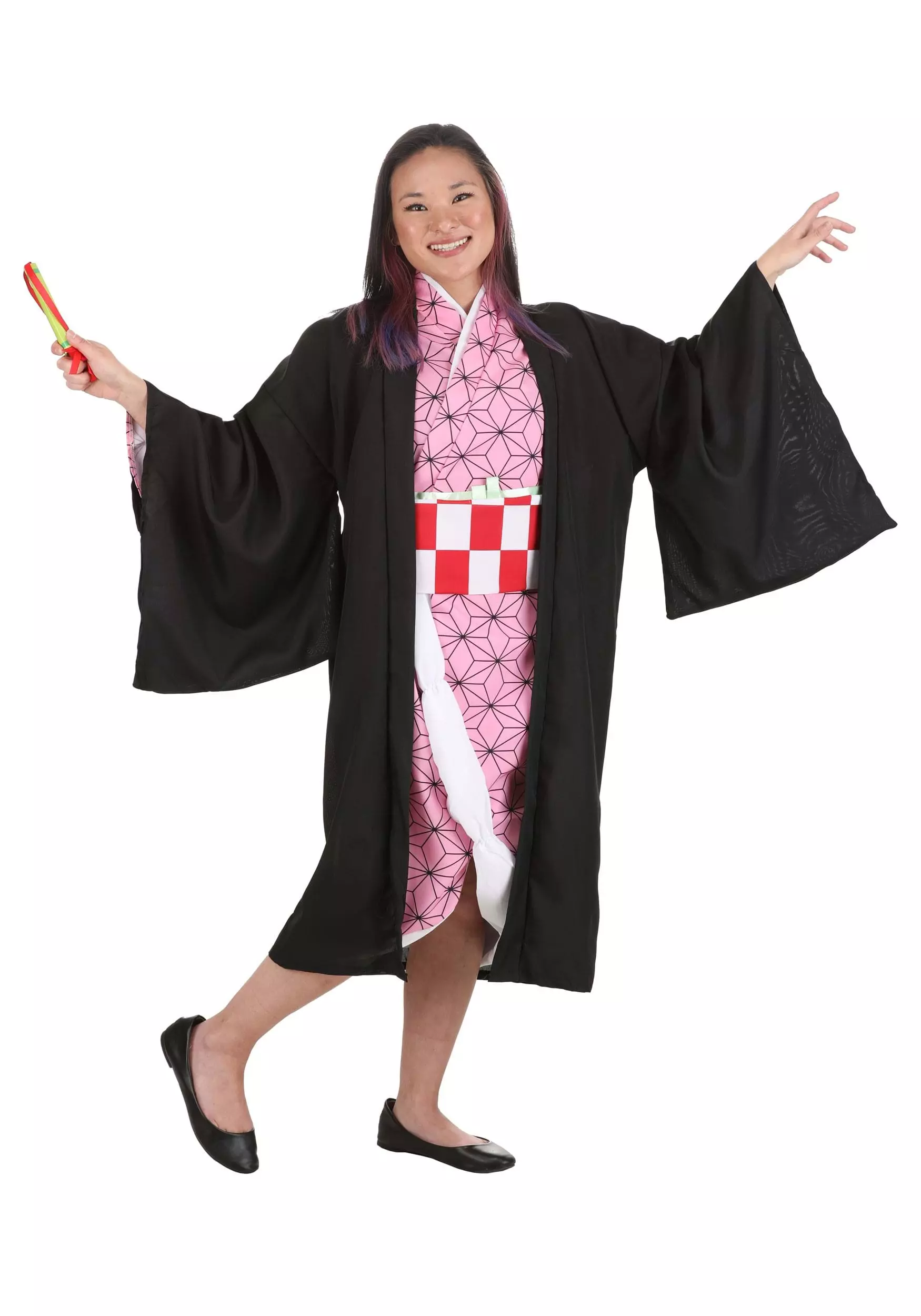 The pink kimono features an all-over geometric print, white edging to give the appearance of a layered ensemble, and a red-and-white checkered sash. A dark brown robe is layered over the pink garment, and with its lightweight materials and flowy sleeves it’s sure to add to the drama of the costume. A narrow green sash with a ribbon tie completes the look.