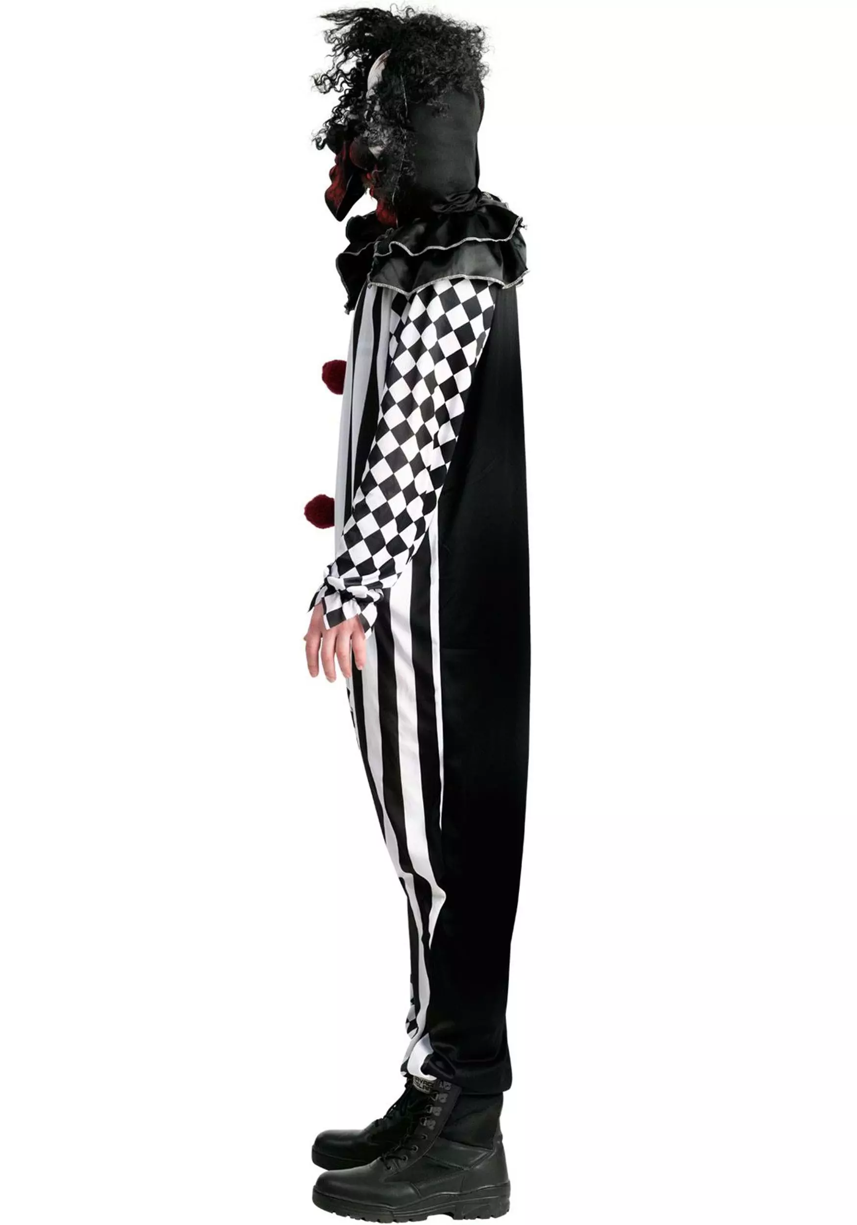 The Circus of Horrors is in town when you wear your Two-Headed Clown Plus Size Costume for Adults! The outfit includes a one-piece jumpsuit that fastens up the back. One half is printed with black and white stripes, while the other half is printed with a pattern of black and white diamonds. A column of three red pompoms is sewn to the center of the torso. A stuffable clown head is attached to the left shoulder and features a ruff around its neck that’s the same as the one sewn to your own collar opening. A matching clown mask with synthetic hair is attached at the center.Â