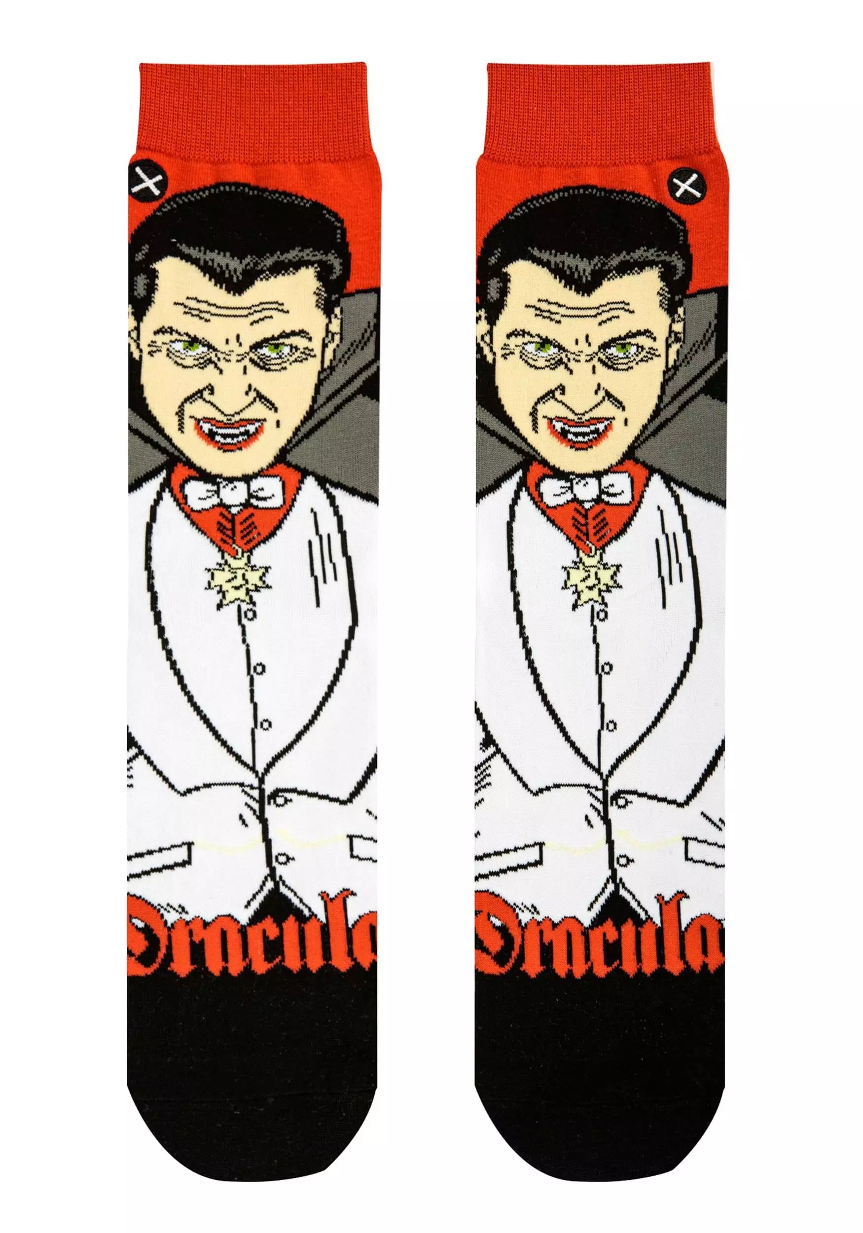 Highlight your favorite classical monster with a pair of Dracula Crew Straight Socks for Adults! The cozy socks have black toes and red ankles, In between, they are printed with an image of the Count himself, looking dapper in evening dress and cape, and baring his fangs in a smile.Â