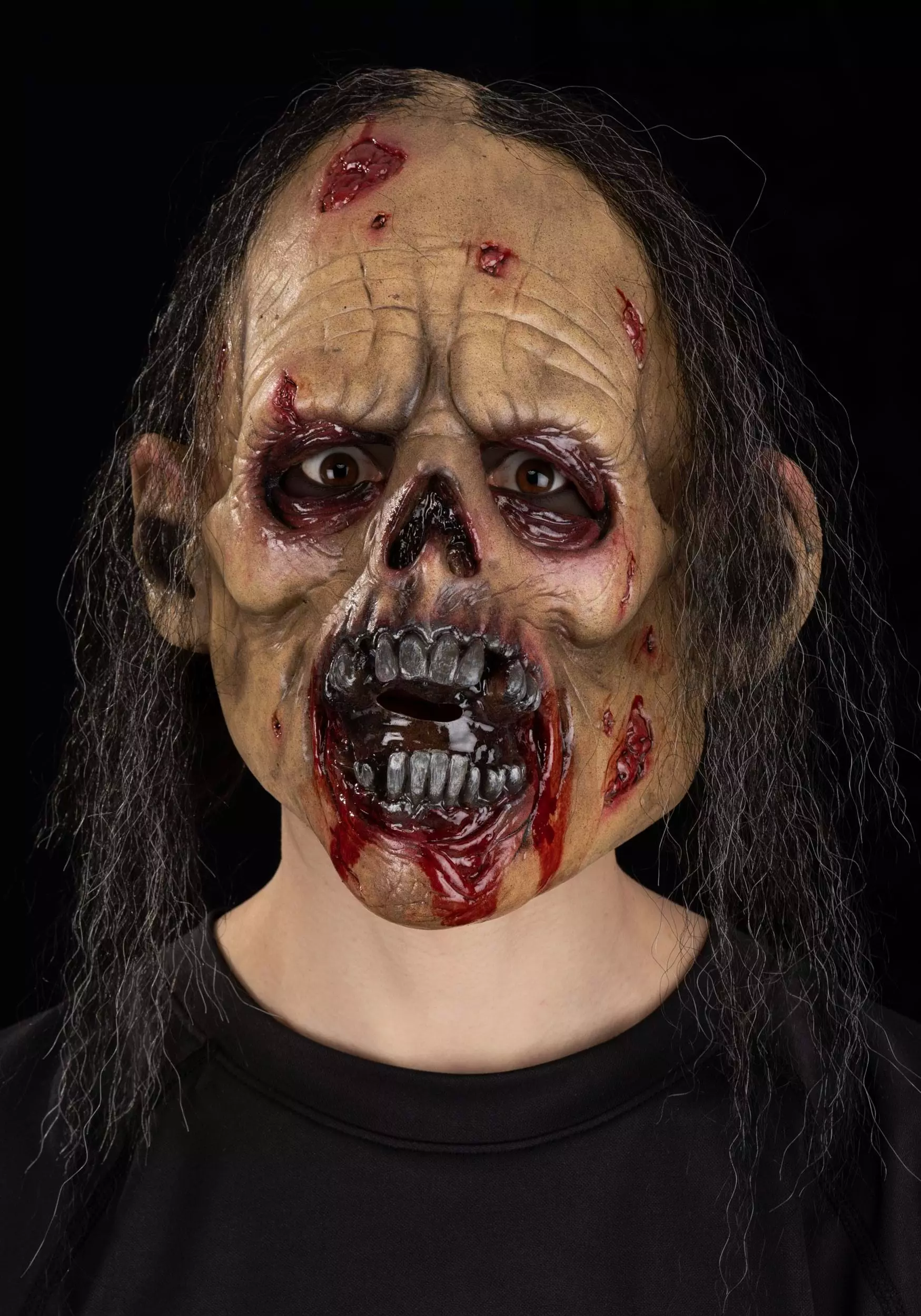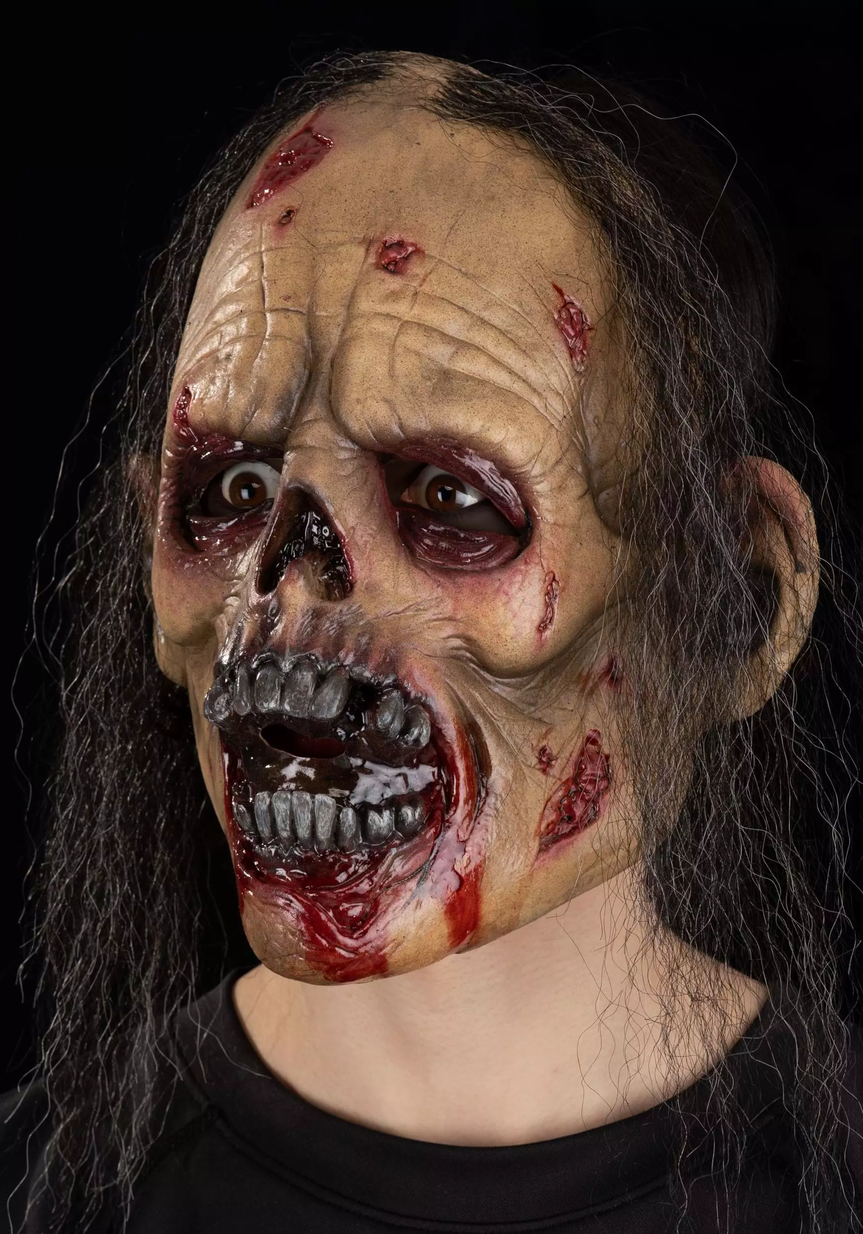 This Adult Carnivore Full Face Mask is made of latex (so if you’ve got an allergy, steer clear!) An elastic band on the back holds the mask in place on your head. The yellowed, peeling skin, jagged teeth, empty eyes, and stringy hair are all carefully designed for a realistically undead look. Just add zombie noises! (“ARRRRRGH!” “RAWR!” and “BRAAAAAINS” are just a few suggestions.) It’s one-size-fits-most, so you and your friends can get together and buy in bulk for the ultimate group costume. You’ll be a graveyard smash for sure.