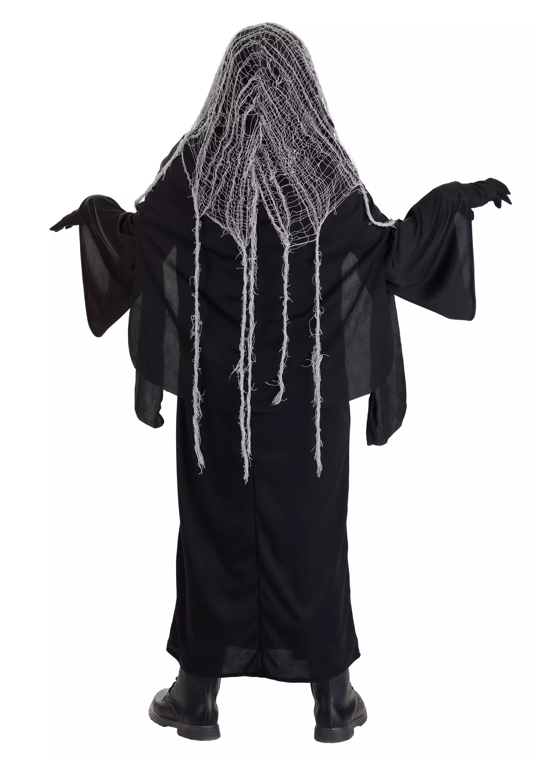 - Robe has tattered gray cheesecloth drapes sewn to front neckline