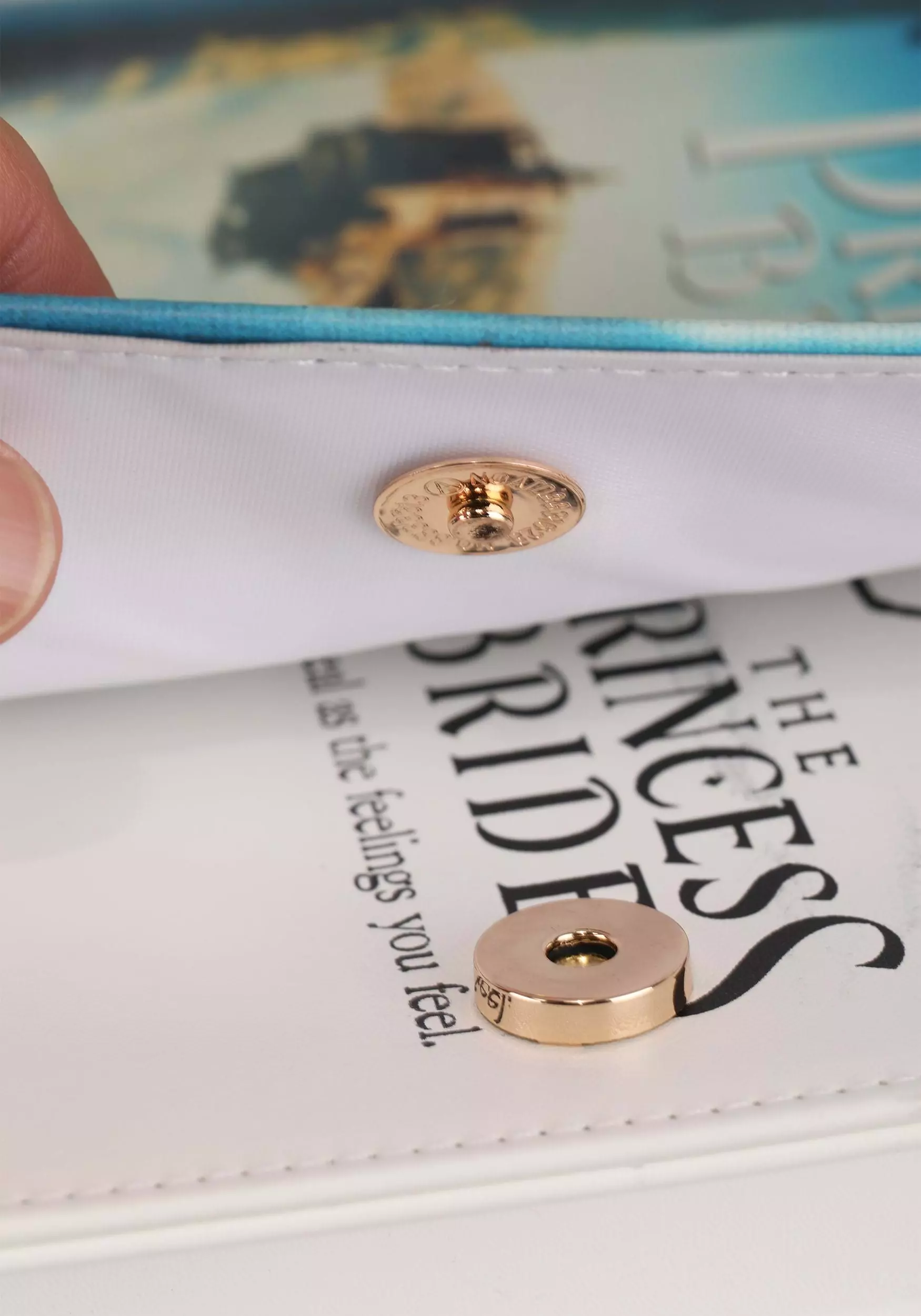 The book-shaped bag features a magnetic snap flap closure that imitates a functioning book cover. When opened a large white pocket with a print like a novel’s title page is revealed. A removable shoulder strap comes included and can be adjusted for the wearer’s comfort.