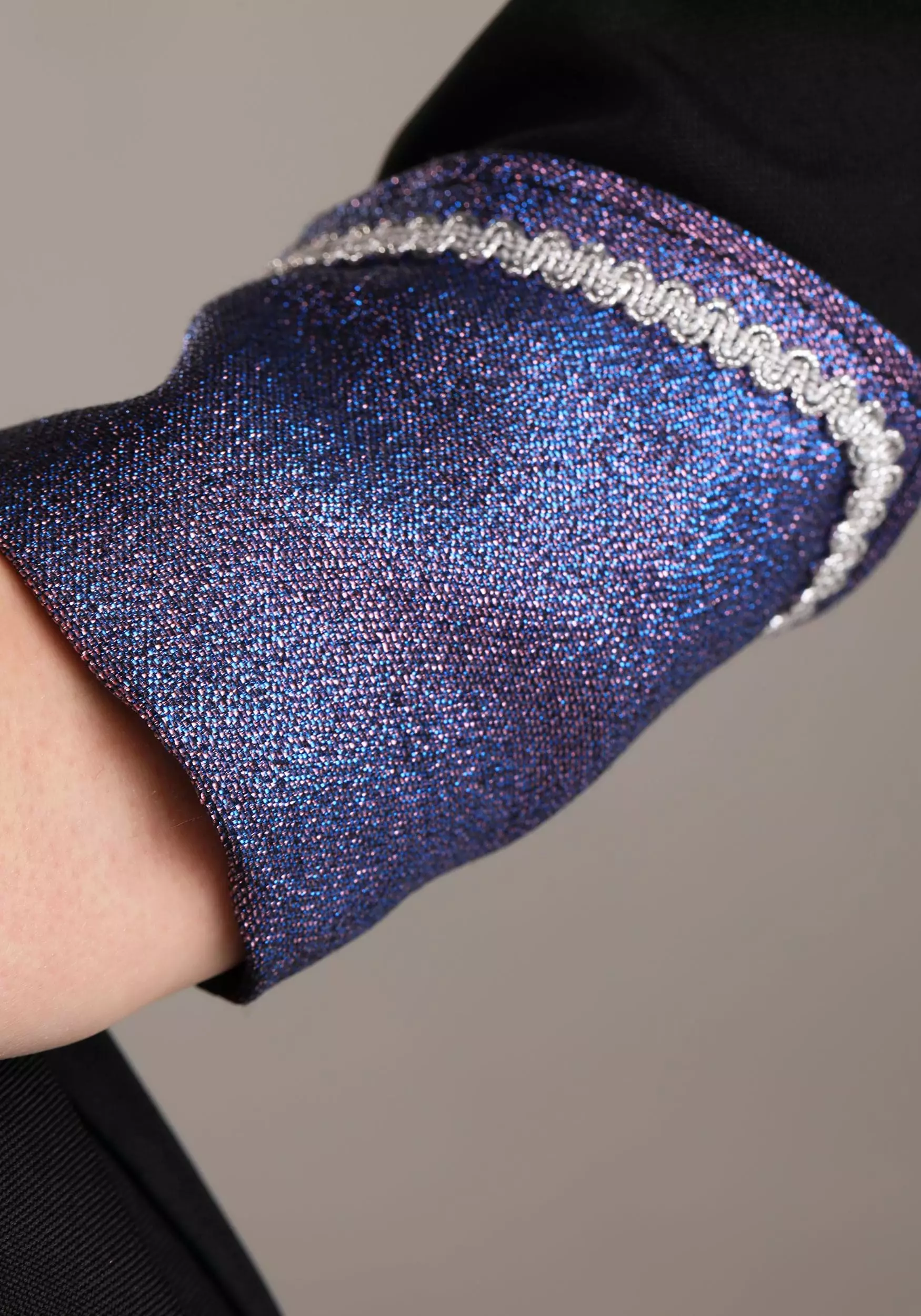- Collar & sleeve cuffs are metallic fabric edged w/ metallic silver braid