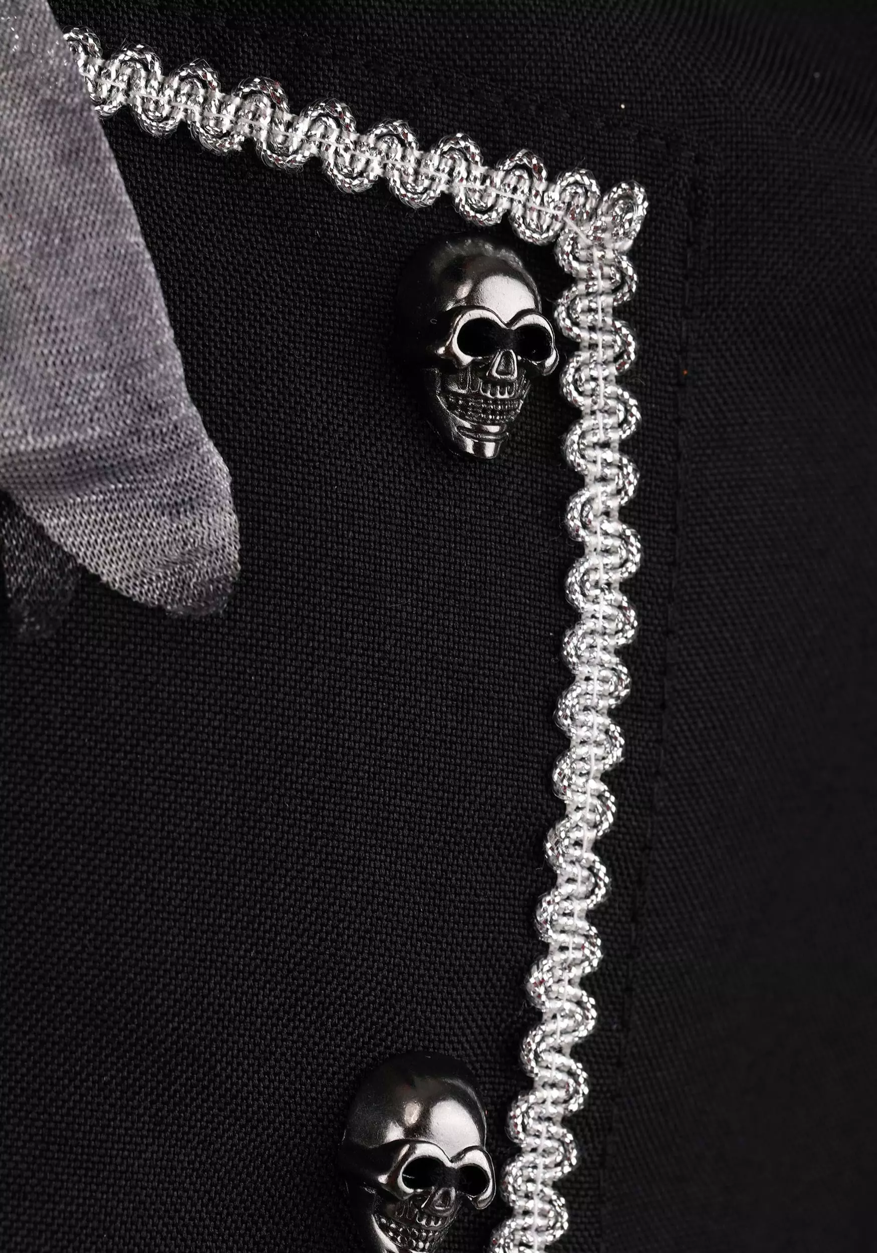 - Bodice inset panel is edged w/ silver braid & decorated w/ skull-shaped metal buttons